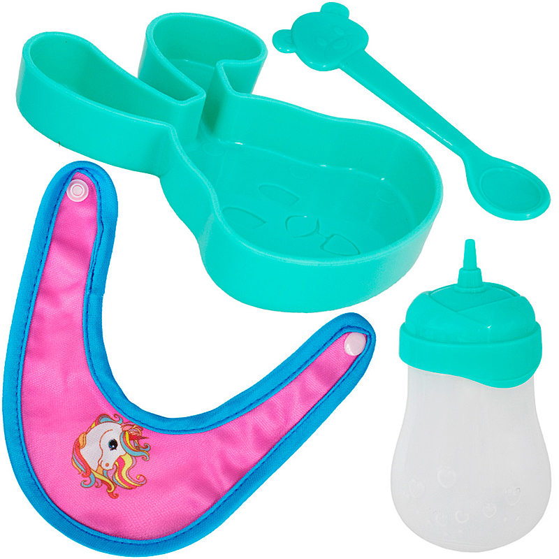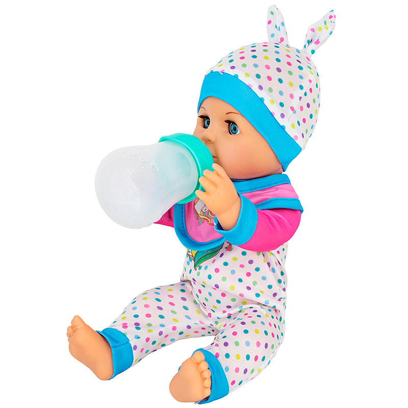 Комплектация: пупс (30 см) – 1 шт., соска-пустышка – 1 шт., бутылочка (12 х 5 х 5 см) – 1 шт., нагрудник – 1 шт., миска в виде зайчика – 1 шт., ложечка – 1 шт.