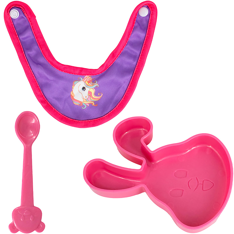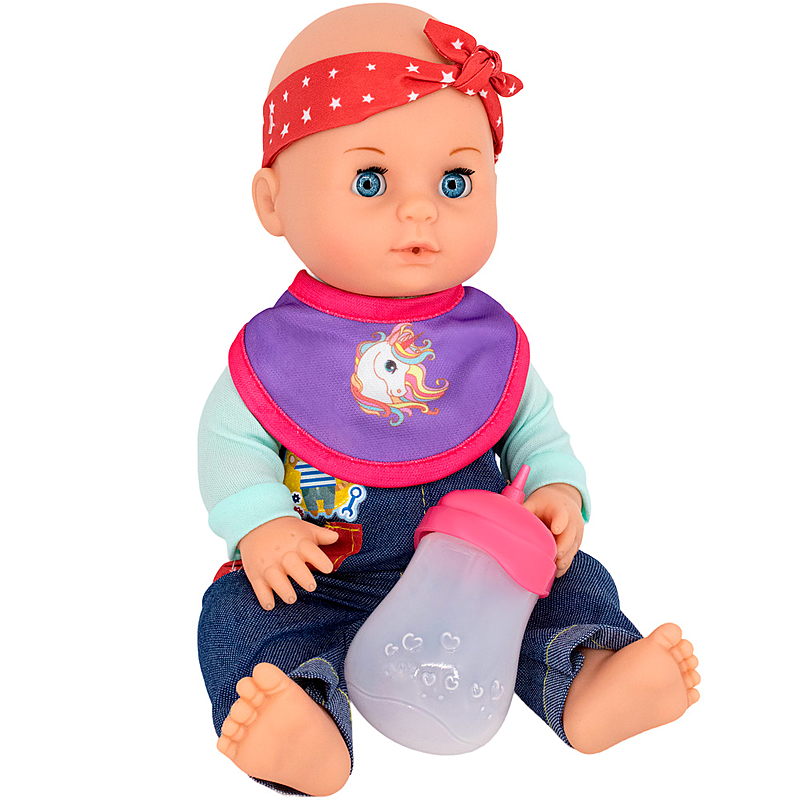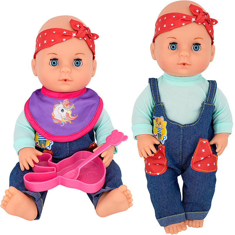 Комплектация: пупс – 1 шт., нагрудник – 1 шт., ложечка – 1 шт., тарелочка – 1 шт., бутылочка для кормления – 1 шт.
