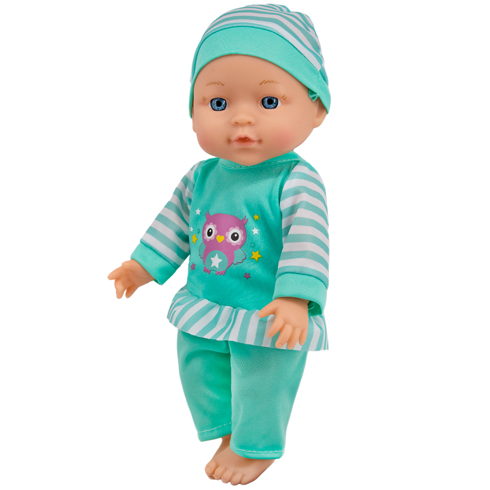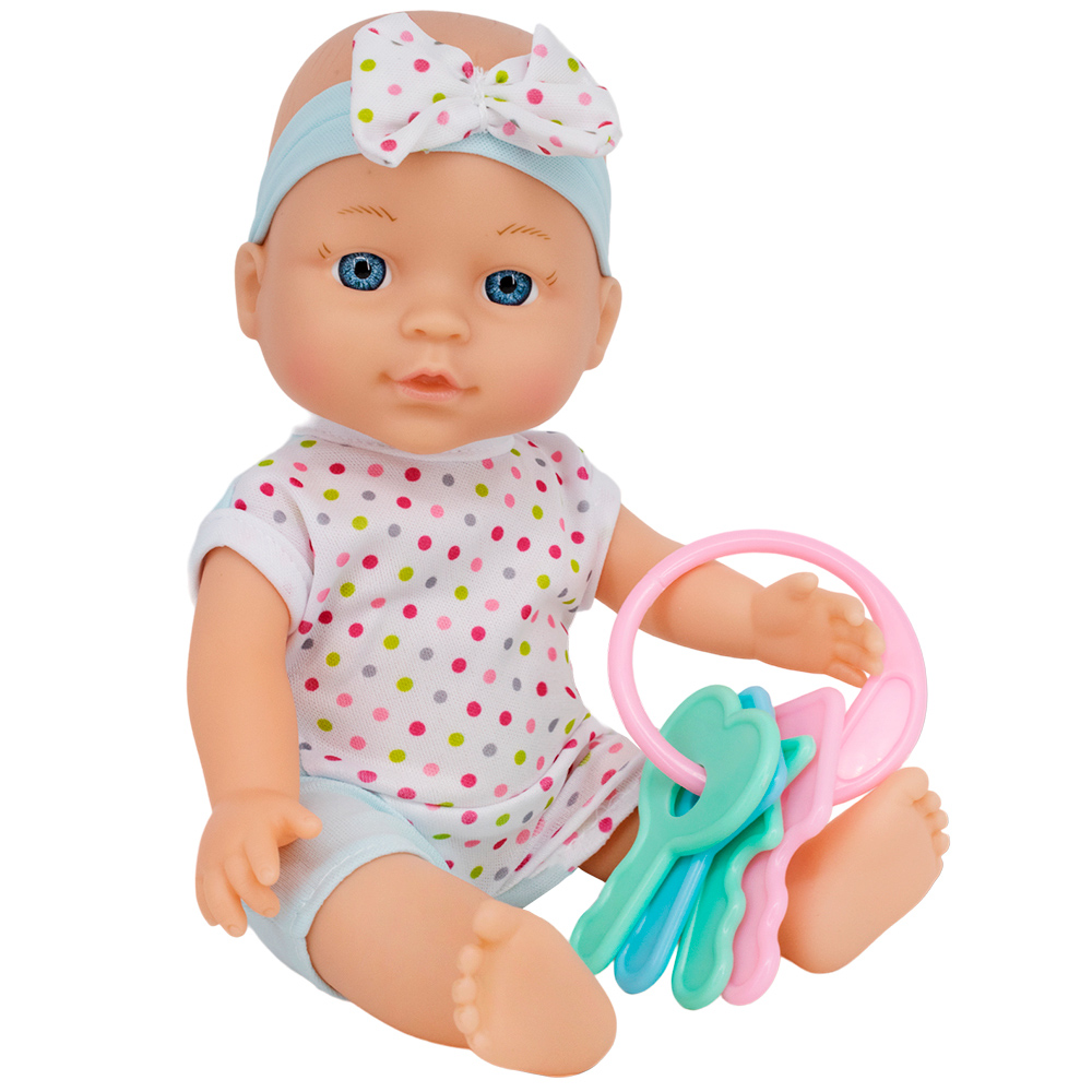 Комплектация: пупс – 1 шт., бутылочка для питья (9 х 3,5 см) – 1 шт., погремушка в виде связки ключей (6,5 х 10 см) – 1 шт., комплект одежды – 1 шт., раскраска – 1 шт., карточка свидетельство о рождении (вырезается) – 1 шт., погремушка (вырезается) – 1 шт., пирамидка (вырезается) – 1 шт.