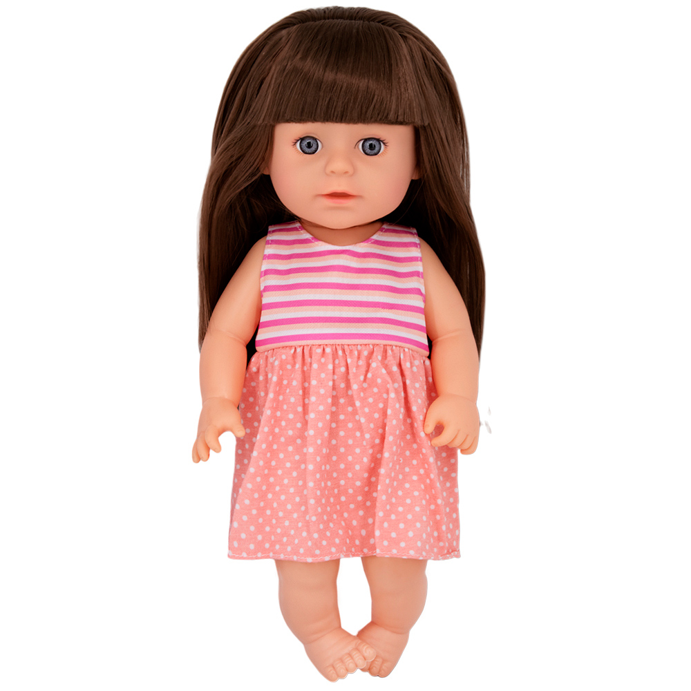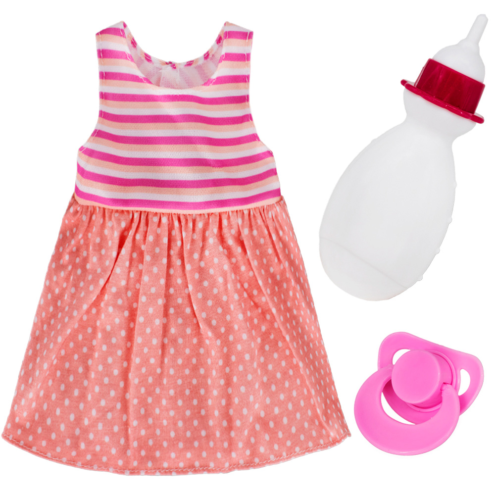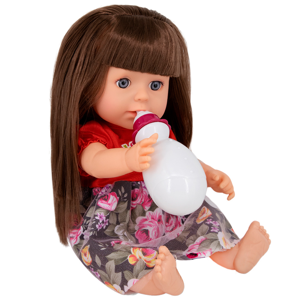 Комплектация: пупс – 1 шт., бутылочка для питья (12 см) – 1 шт., соска-пустышка (4 х 5 см) – 1 шт., комплект одежды (платье) – 1 шт., раскраска – 1 шт.