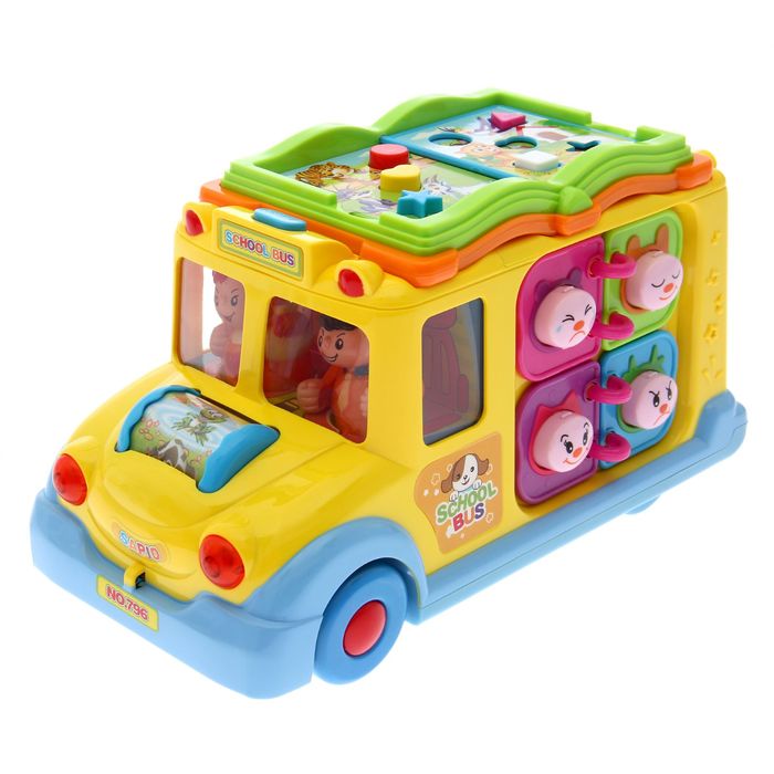 На капоте машины есть ролик: если его покрутить, то заиграет мелодия и будут светиться фары. Малыш может взять игрушку с собой — у неё есть специальная верёвочка. При движении автобуса пассажиры в кабине зашевелятся. На крыше машины есть кнопки, нажатие на которые имитирует звук животных.