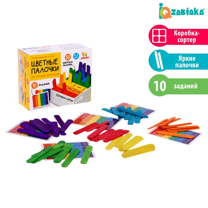 Внутри вы найдёте коробку-сортер, 50 цветных палочек и 10 заданий.