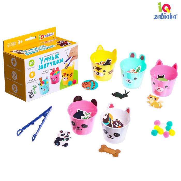 Развивающий сортер «Умные зверушки» поможет малышам от 3 лет изучить основные цвета и счёт, и потренировать мелкую моторику, раскладывая пинцетом бомбошки по забавным ведёркам с мордочками. А с помощью занятий с карточками вы познакомите ребёнка с разными животными, научите размышлять и расширите его кругозор.
