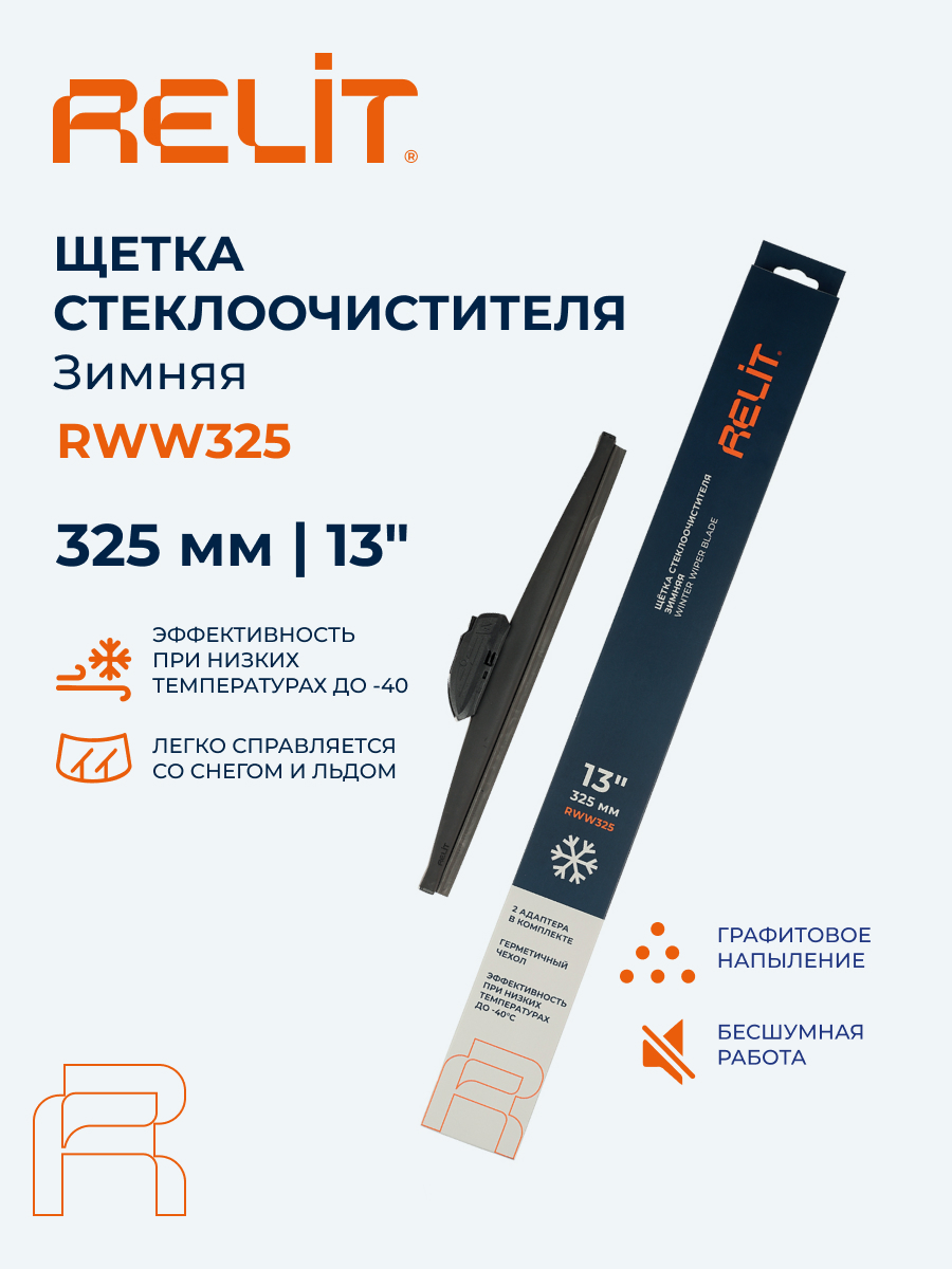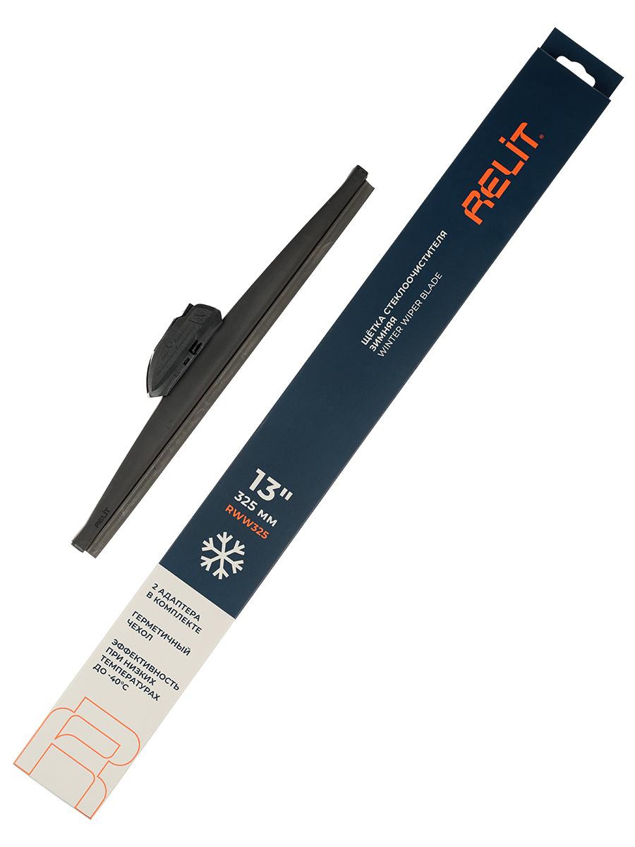Зимняя щетка стеклоочистителя RELIT 325 мм (13") эффективно очищает стекло без наледи и разводов. Для зимней щетки стеклоочистителя RELIT 325 мм используется морозоустойчивый эластичный элемент, сохраняющий гибкость даже при сильных минусовых температурах и обеспечивающий плотный прижим к стеклу. Герметичный защитный чехол предотвращает попадание снега, льда и влаги внутрь конструкции, сохраняет подвижность механизмов и продлевает срок службы щетки. Резина устойчива к химическим реагентам, не дубеет и остается мягкой в условиях обледенения и снегопада, эффективно очищая стекло без пропусков и разводов. Специальный зимний профиль рабочей кромки снижает вибрации, уменьшает парусность и обеспечивает стабильную работу дворников в сложных погодных условиях. Щетка RELIT совместима с креплениями HOOK и BAYONET. Подходит для автомобилей, оснащённых указанными типами креплений.