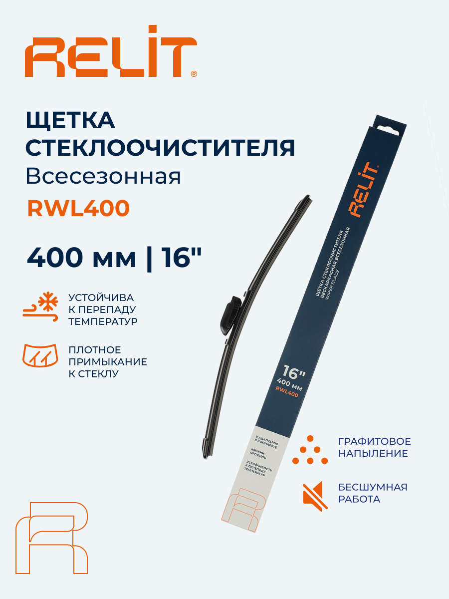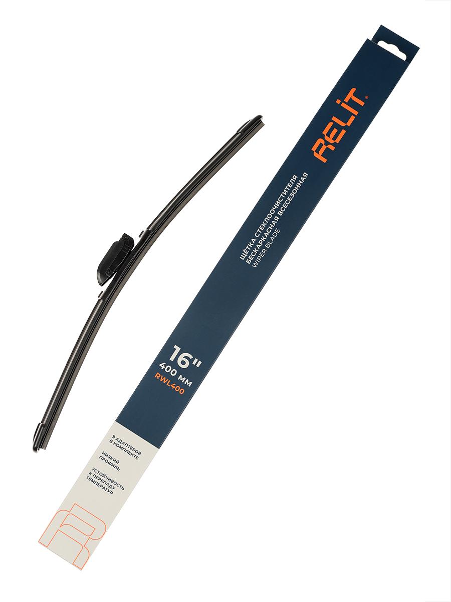 Бескаркасная щетка стеклоочистителя RELIT 400 мм (16") с адаптерами подходит для большинства автомобилей. Аэродинамический низкий профиль снижает шум, обеспечивает равномерный прижим и эффективную очистку стекла без разводов, подходит для всесезонной эксплуатации. Для бескаркасной щетки стеклоочистителя RELIT 400 мм используется износостойкий упругий элемент, обеспечивающий равномерный прижим по всей длине стекла. Аэродинамическая форма конструкции снижает шум и вибрации, обеспечивая стабильную работу дворников даже на высокой скорости. Щетка сохраняет эластичность, плотно прилегает к стеклу и эффективно очищает поверхность без разводов. Низкий профиль обеспечивает лучшую обзорность в дождь, снег и межсезонье. Щетка RELIT совместима с креплениями HOOK, SIDE PIN, PUSH BUTTON (16 мм и 19 мм), PINCH TAB, TOP LOCK, BAYONET ARM, REN-DK/VATL5.1 и LZS-LB/DNTL1.1. Подходит для большинства автомобилей с указанными типами креплений. Комплект адаптеров: 8 шт.