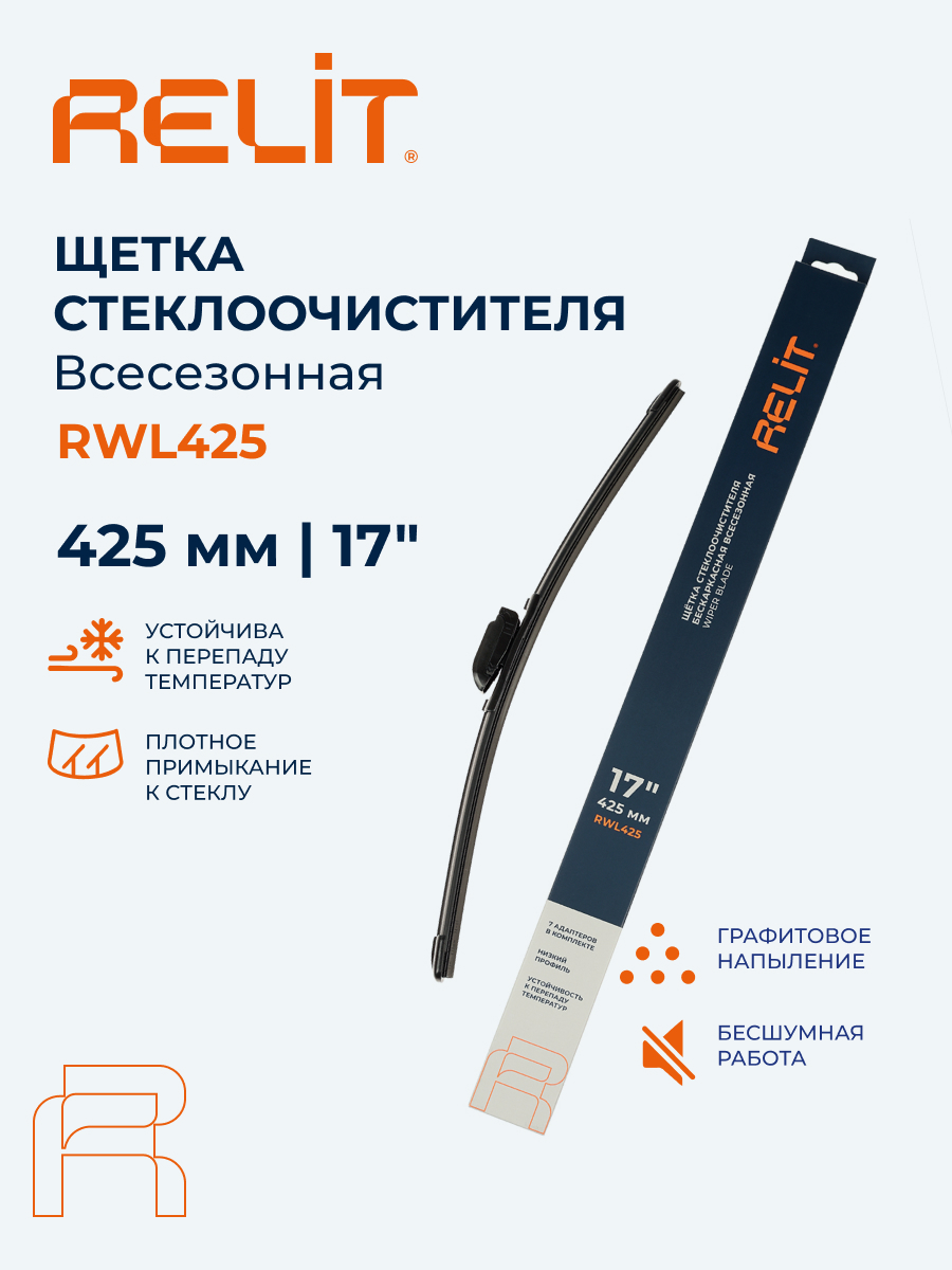 Бескаркасная щетка стеклоочистителя RELIT 425 мм (17 подходит для большинства автомобилей. Аэродинамический низкий профиль снижает шум, обеспечивает равномерный прижим и эффективную очистку стекла без разводов, подходит для всесезонной эксплуатации. Для бескаркасной щетки стеклоочистителя RELIT 425 мм используется износостойкий упругий элемент, обеспечивающий равномерный прижим по всей длине стекла. Аэродинамическая форма конструкции снижает шум и вибрации, обеспечивая стабильную работу дворников даже на высокой скорости. Щетка сохраняет эластичность, плотно прилегает к стеклу и эффективно очищает поверхность без разводов. Низкий профиль обеспечивает лучшую обзорность в дождь, снег и межсезонье. Щетка RELIT совместима с креплениями HOOK, SIDE PIN, PUSH BUTTON (16 мм и 19 мм), PINCH TAB, TOP LOCK и BAYONET ARM. Подходит для большинства автомобилей с указанными типами креплений. Комплект адаптеров: 6 шт.