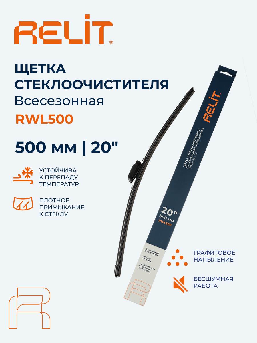 Бескаркасная щетка стеклоочистителя RELIT 500 мм (20") с адаптерами подходит для большинства автомобилей. Аэродинамический низкий профиль снижает шум, обеспечивает равномерный прижим и эффективную очистку стекла без разводов, подходит для всесезонной эксплуатации. Для бескаркасной щетки стеклоочистителя RELIT 500 мм используется износостойкий упругий элемент, обеспечивающий равномерный прижим по всей длине стекла. Аэродинамическая форма конструкции снижает шум и вибрации, обеспечивая стабильную работу дворников даже на высокой скорости. Щетка сохраняет эластичность, плотно прилегает к стеклу и эффективно очищает поверхность без разводов. Низкий профиль обеспечивает лучшую обзорность в дождь, снег и межсезонье. Щетка RELIT совместима с креплениями HOOK, SIDE PIN, PUSH BUTTON (16 мм и 19 мм), PINCH TAB, TOP LOCK, BAYONET ARM, LZS-LB/DNTL1.1 и BAYONET. Подходит для большинства автомобилей с указанными типами креплений. Комплект адаптеров: 8 шт.