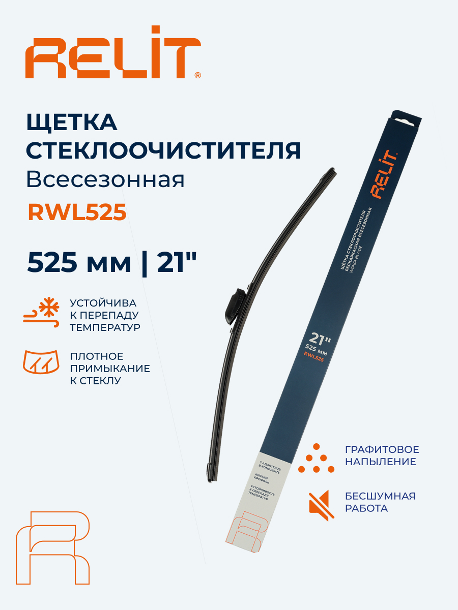 Бескаркасная щетка стеклоочистителя RELIT 525 мм (21") с адаптерами подходит для большинства автомобилей. Аэродинамический низкий профиль снижает шум, обеспечивает равномерный прижим и эффективную очистку стекла без разводов, подходит для всесезонной эксплуатации. Для бескаркасной щетки стеклоочистителя RELIT 525 мм используется износостойкий упругий элемент, обеспечивающий равномерный прижим по всей длине стекла. Аэродинамическая форма конструкции снижает шум и вибрации, обеспечивая стабильную работу дворников даже на высокой скорости. Щетка сохраняет эластичность, плотно прилегает к стеклу и эффективно очищает поверхность без разводов. Низкий профиль обеспечивает лучшую обзорность в дождь, снег и межсезонье. Щетка RELIT совместима с креплениями HOOK, SIDE PIN, PUSH BUTTON (16 мм и 19 мм), PINCH TAB, TOP LOCK и BAYONET ARM. Подходит для большинства автомобилей с указанными типами креплений. Комплект адаптеров: 6 шт.
