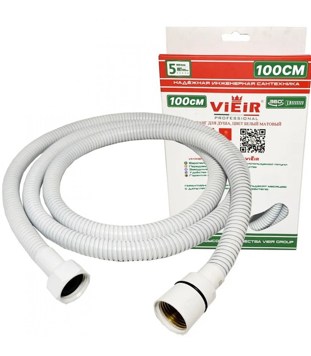 Шланг для душа VIEIR VR60100F, 100 см, белый матовый подходит для любых типов душевых систем и смесителей, а также может использоваться в качестве удлинителя для других устройств.