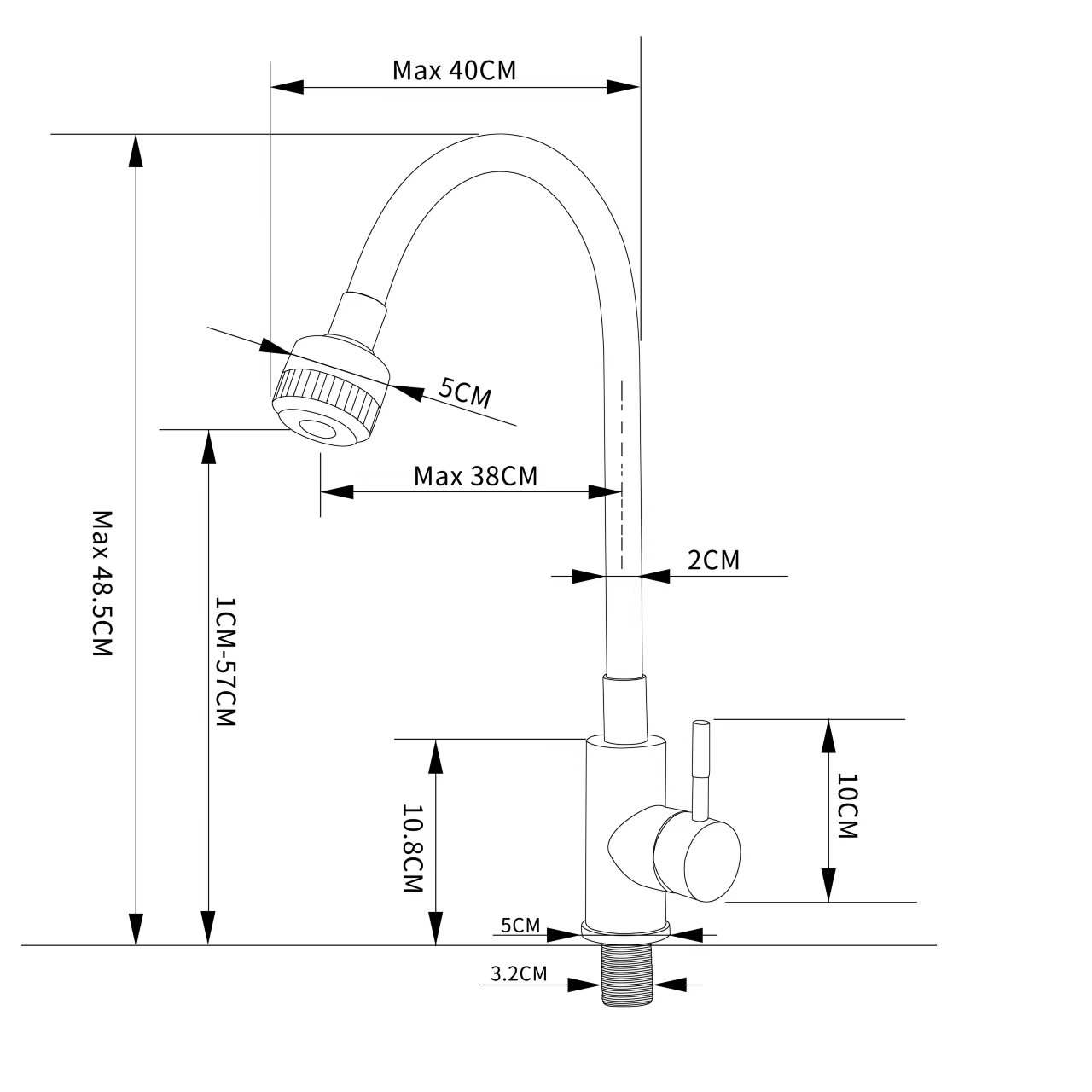 Высокий гибкий излив длиной 46,2 см позволяет комфортно пользоваться мойкой, мыть крупную посуду и наполнять ёмкости водой. Пластиковый аэратор способствует экономии воды и уменьшает образование брызг.
