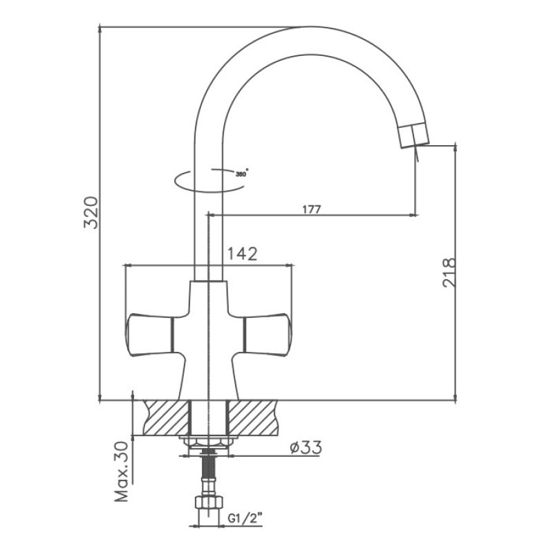 Монтаж выполняется горизонтально на одно отверстие диаметром 33 мм, при этом максимальная глубина монтажа не должна превышать 30 мм. Подводка гибкая, со стандартом 1/2″ — она входит в комплект вместе со смесителем и инструкцией.