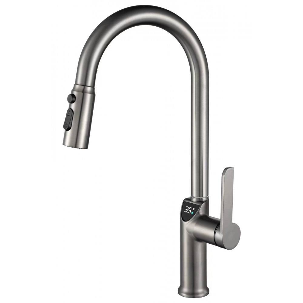 Смеситель для кухни Dikalan DT40371-4 цвета серый графит имеет стильный и современный дизайн, который идеально сочетается с интерьером кухни. Вытяжная лейка и 3 режима использования обеспечивают удобство при мытье, позволяя достигнуть любой части мойки.