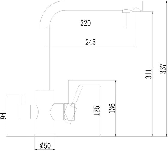 Смеситель на кухню с высоким гусаком монтируется при помощи удобного крепежа на гайке в одно отверстие на раковину, на столешницу или на кухонную мойку. Подключается к холодной, горячей и чистой воде от фильтра гибкими шлангами, в комплекте гибкая подводка.