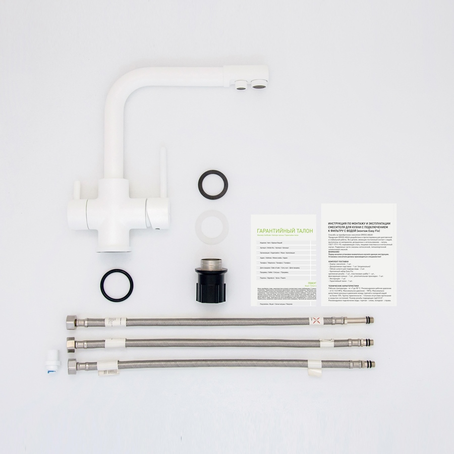 Смеситель Ecolife Matt White - источник свежей питьевой воды на вашей кухне и незаменимый помощник при готовке и мытье посуды. Универсальный 2 в 1: большая ручка - подача и смешивание горячей и холодной водопроводной воды. Малая ручка - подача фильтрованной воды по отдельному каналу через дополнительный встроенный аэратор. Больше нет необходимости покупать питьевую воду в бутылях, которые занимают место на кухне, а затем утилизировать пластиковую тару. Высота излива 275 мм позволяет набрать воду в высокую емкость или помыть овощи без разбрызгивания воды, угол поворота излива 180 градусов обеспечивает охват рабочей зоны