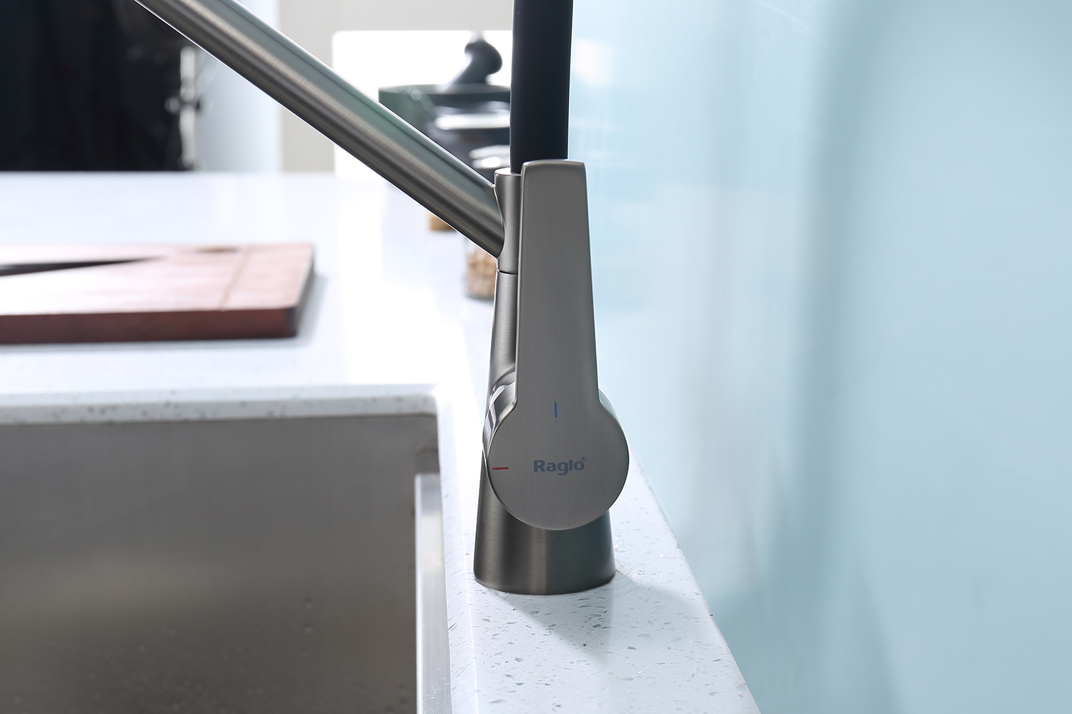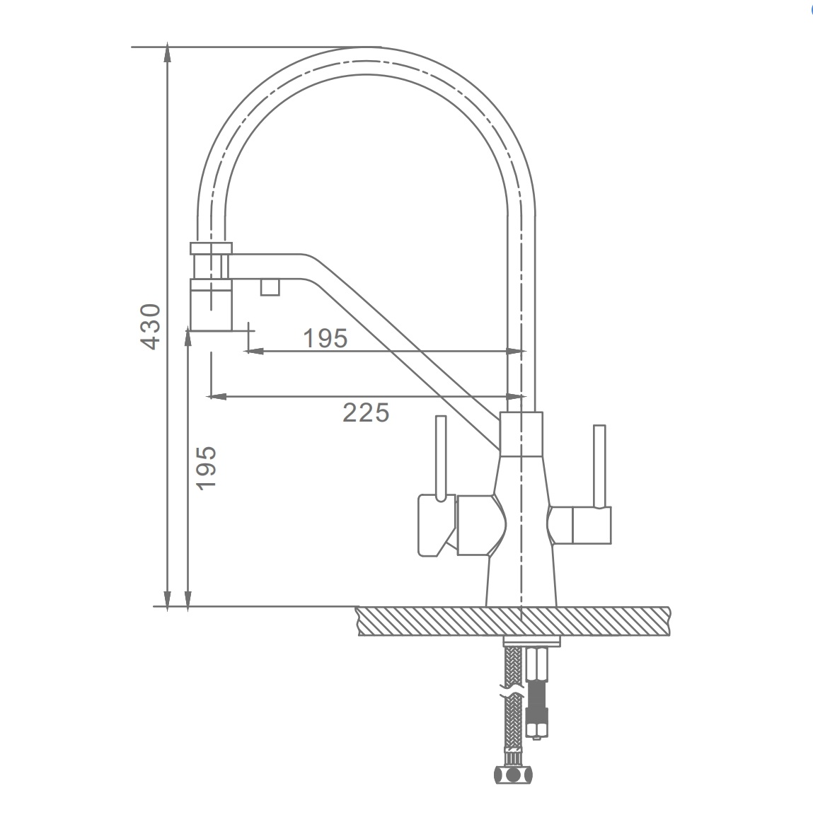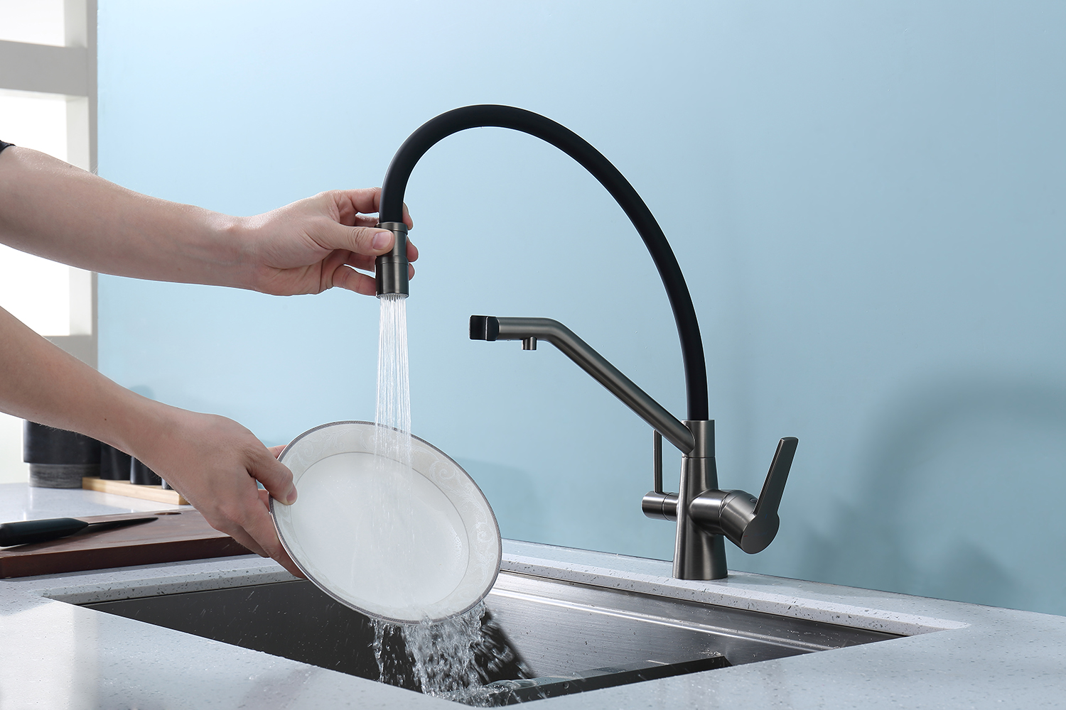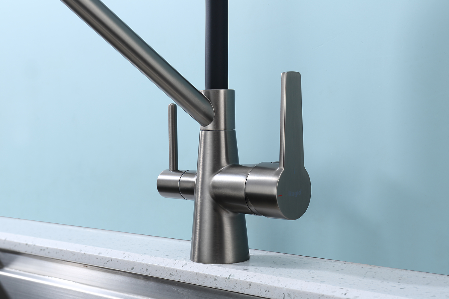 Рычажное управление обеспечивает плавное и точное регулирование температуры и напора воды. Смеситель позволяет одновременно подключаться как к водопроводу, так и к фильтру, обеспечивая доступ как к обычной, так и к питьевой воде.