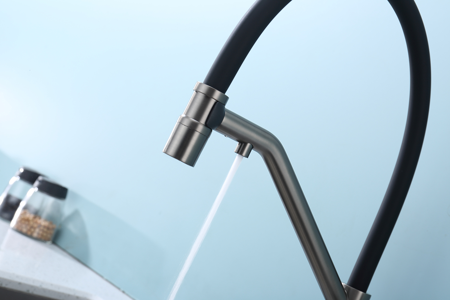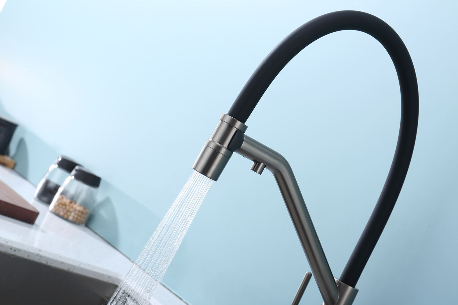 Особенность модели — гибкий съемный излив на магните, который значительно расширяет зону использования смесителя. Благодаря гибкому шлангу можно легко мыть объемную посуду и регулировать положение подачи воды под любые нужды. Конструкция предусматривает отдельный выход для фильтрованной воды, что делает использование смесителя максимально удобным.