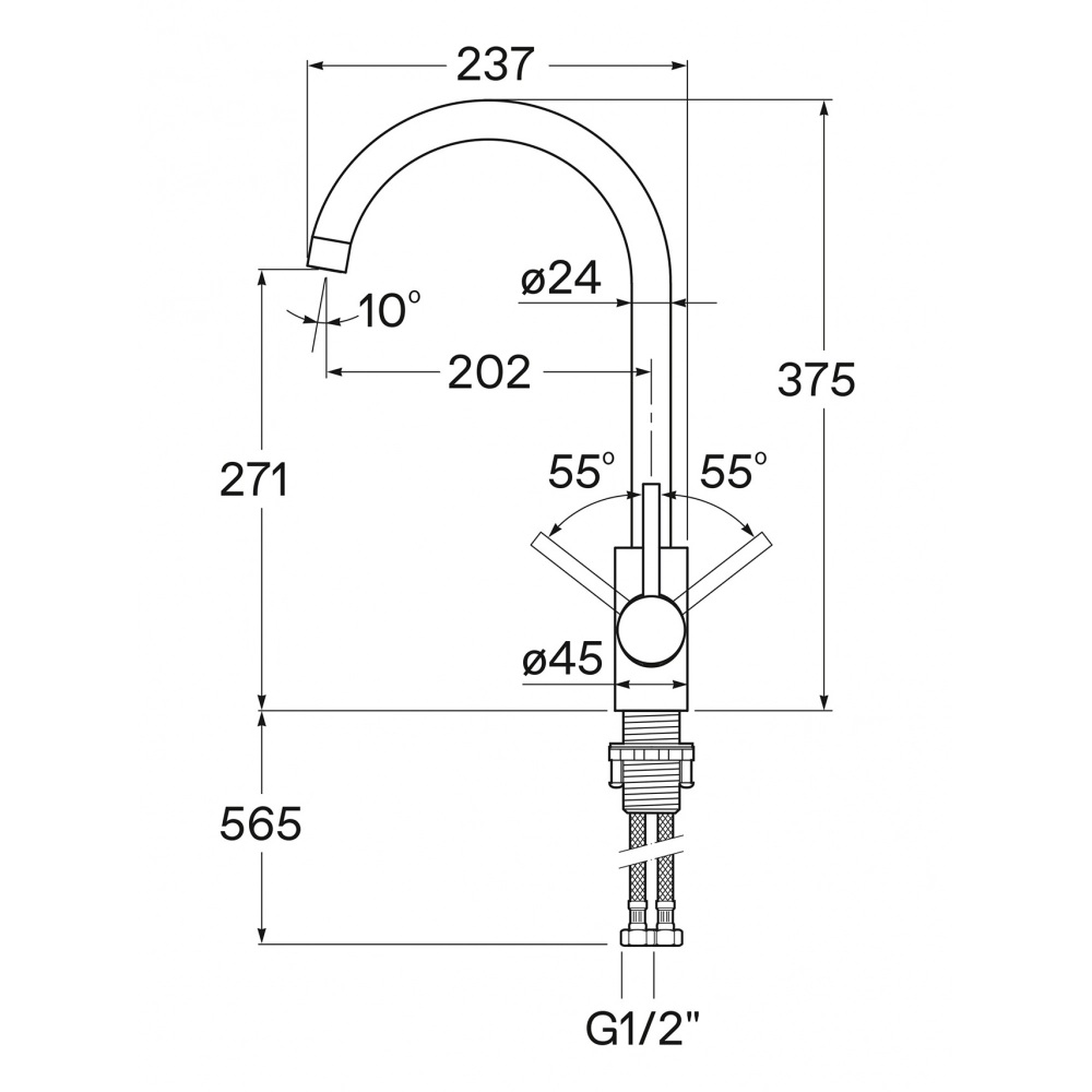Смеситель оснащён усиленной гибкой подводкой PEX в стальной оплётке длиной 60 см. Подключение осуществляется через стандартное соединение G1/2". Монтаж производится на одно отверстие (диаметр 33–35 мм) с помощью двух винтов.