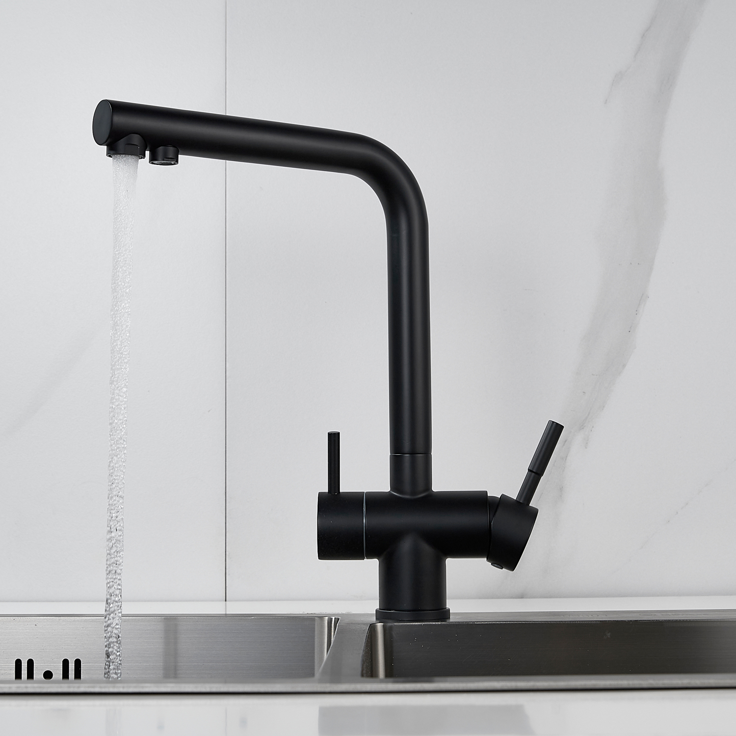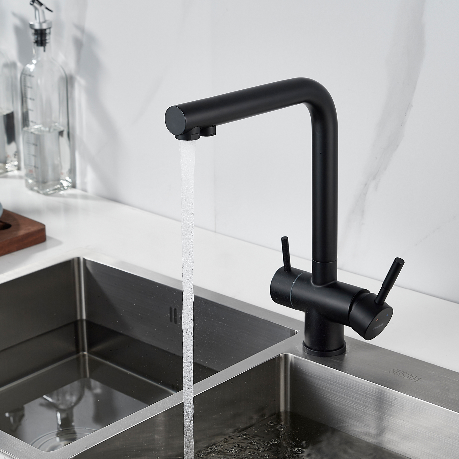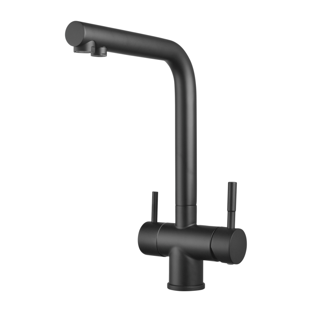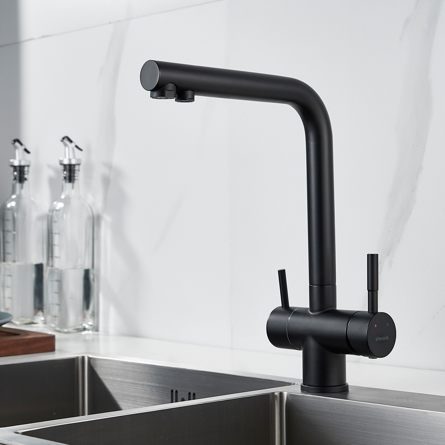 Смеситель для кухни Shevanik S468Н в черном исполнении с возможностью подключения фильтра изготовлен из нержавеющей стали, что обеспечивает его прочность и устойчивость к коррозии. Современный дизайн с матовой поверхностью придает изделию элегантный вид и скрывает следы от пальцев. Керамический картридж гарантирует долговечность и плавность хода, а совмещенный излив позволяет подавать как водопроводную, так и фильтрованную воду.
