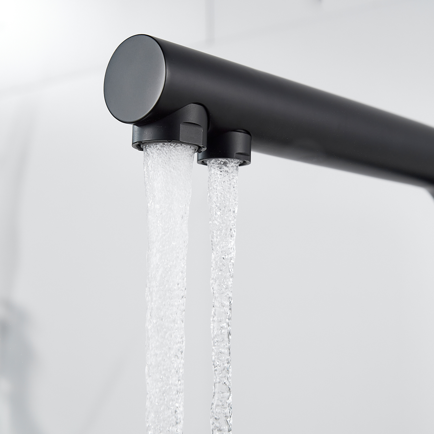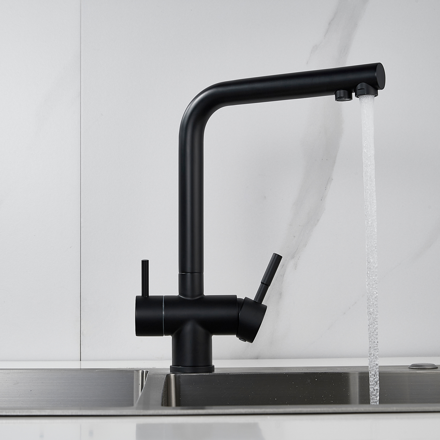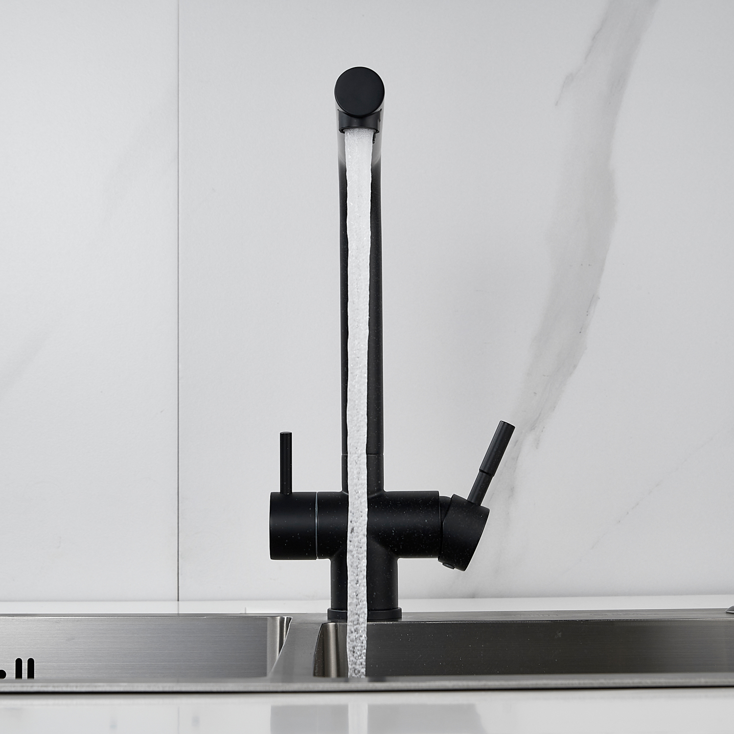 Смеситель для кухни Shevanik S468Н в черном исполнении с возможностью подключения фильтра изготовлен из нержавеющей стали, что обеспечивает его прочность и устойчивость к коррозии. Современный дизайн с матовой поверхностью придает изделию элегантный вид и скрывает следы от пальцев. Керамический картридж гарантирует долговечность и плавность хода, а совмещенный излив позволяет подавать как водопроводную, так и фильтрованную воду.