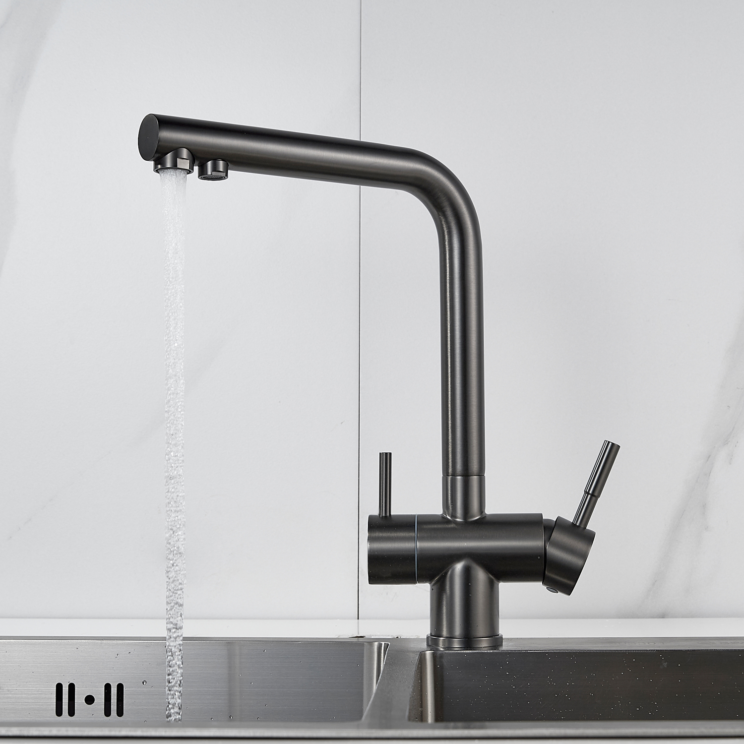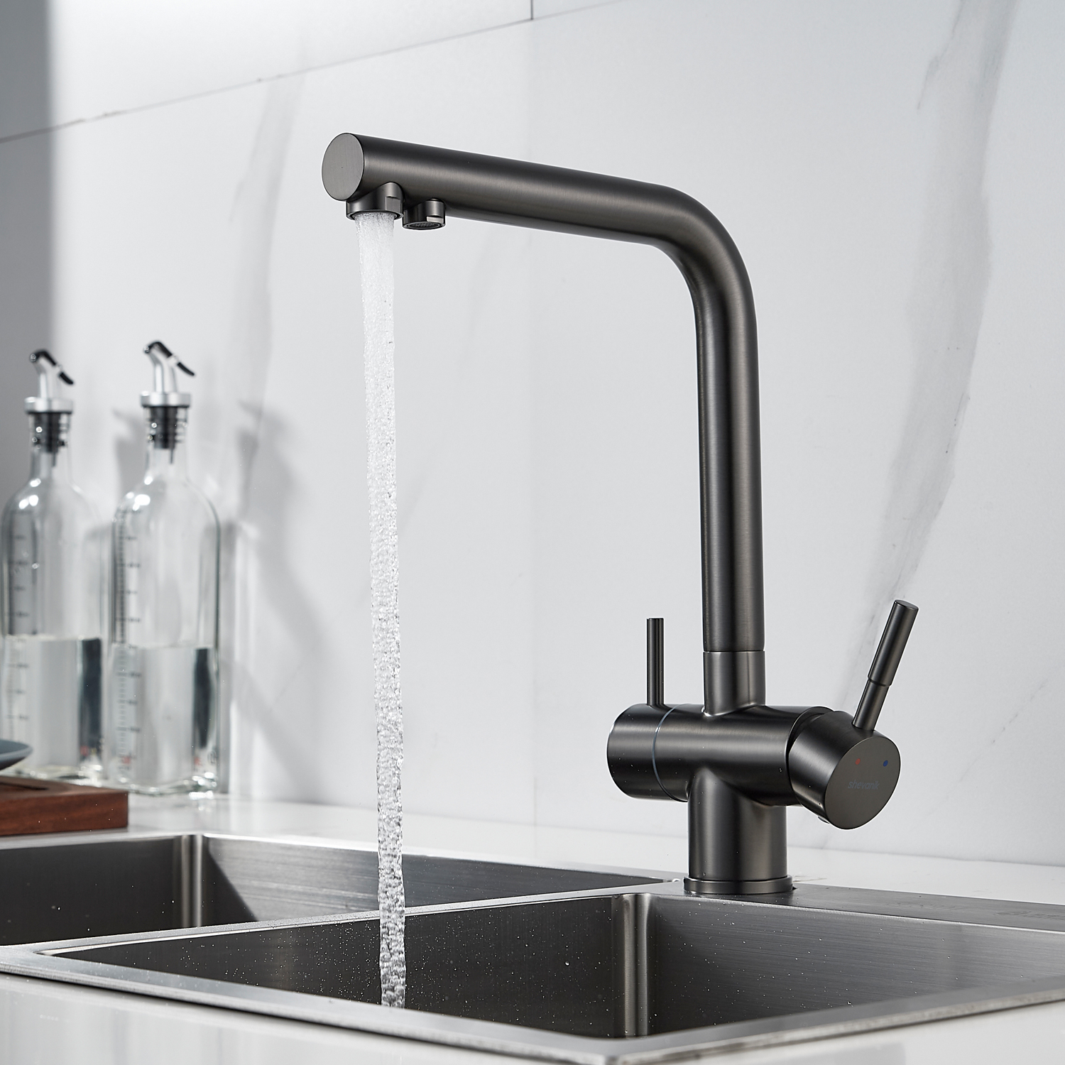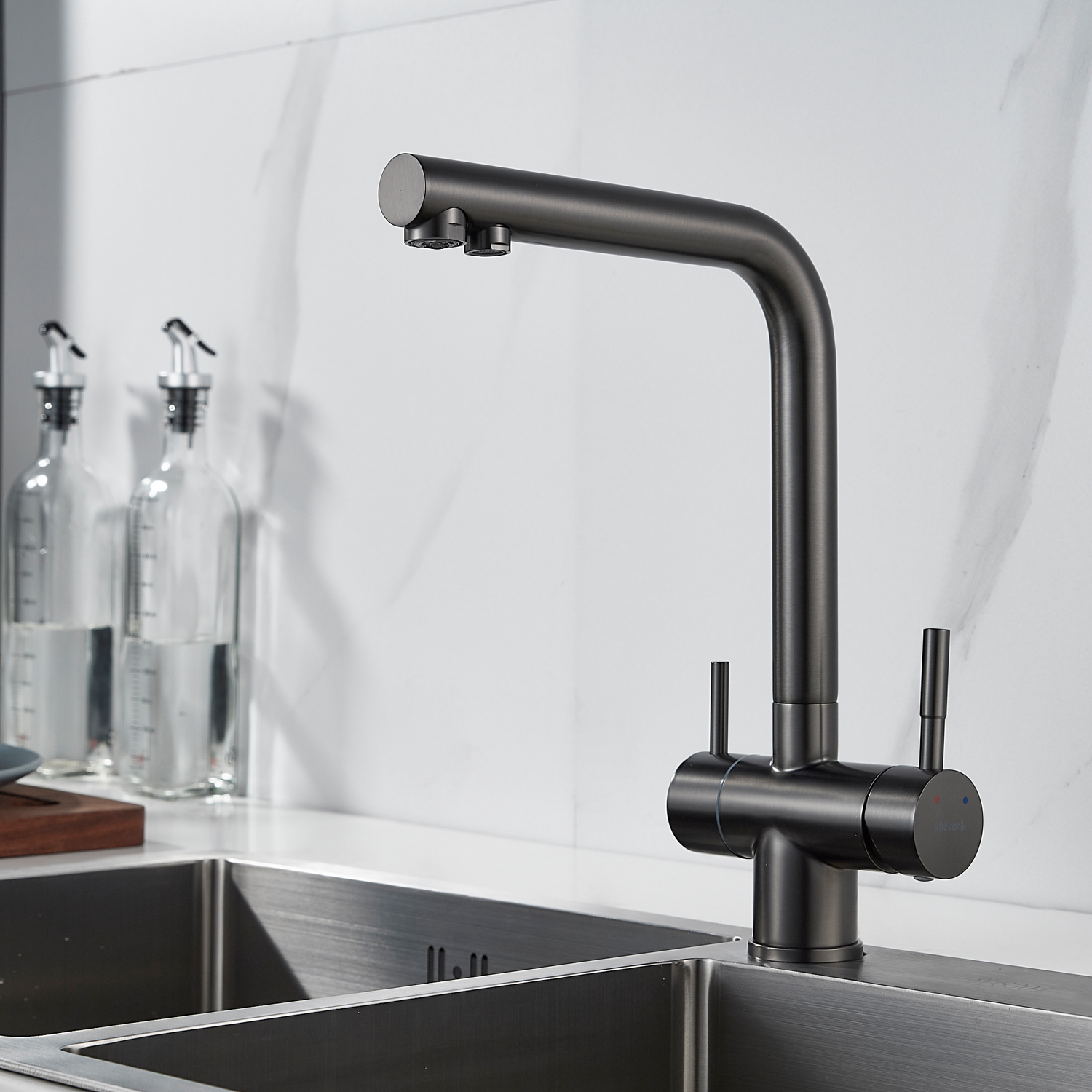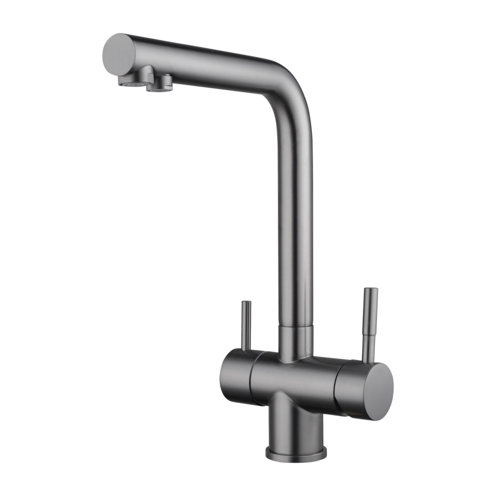 Смеситель для кухни Shevanik S468Т в исполнении оружейная сталь с возможностью подключения фильтра изготовлен из нержавеющей стали, что обеспечивает его прочность и устойчивость к коррозии. Современный дизайн с матовой поверхностью придает изделию элегантный вид и скрывает следы от пальцев. Керамический картридж гарантирует долговечность и плавность хода, а совмещенный излив позволяет подавать как водопроводную, так и фильтрованную воду.