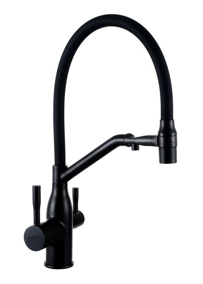 Модель отличается практичным дизайном с черным покрытием soft-touch, которое не только выглядит элегантно, но и приятно на ощупь. Гибкий черный излив является главным преимуществом этой модели — он позволяет легко направлять поток воды в любую точку раковины, что особенно удобно при мытье крупной посуды.