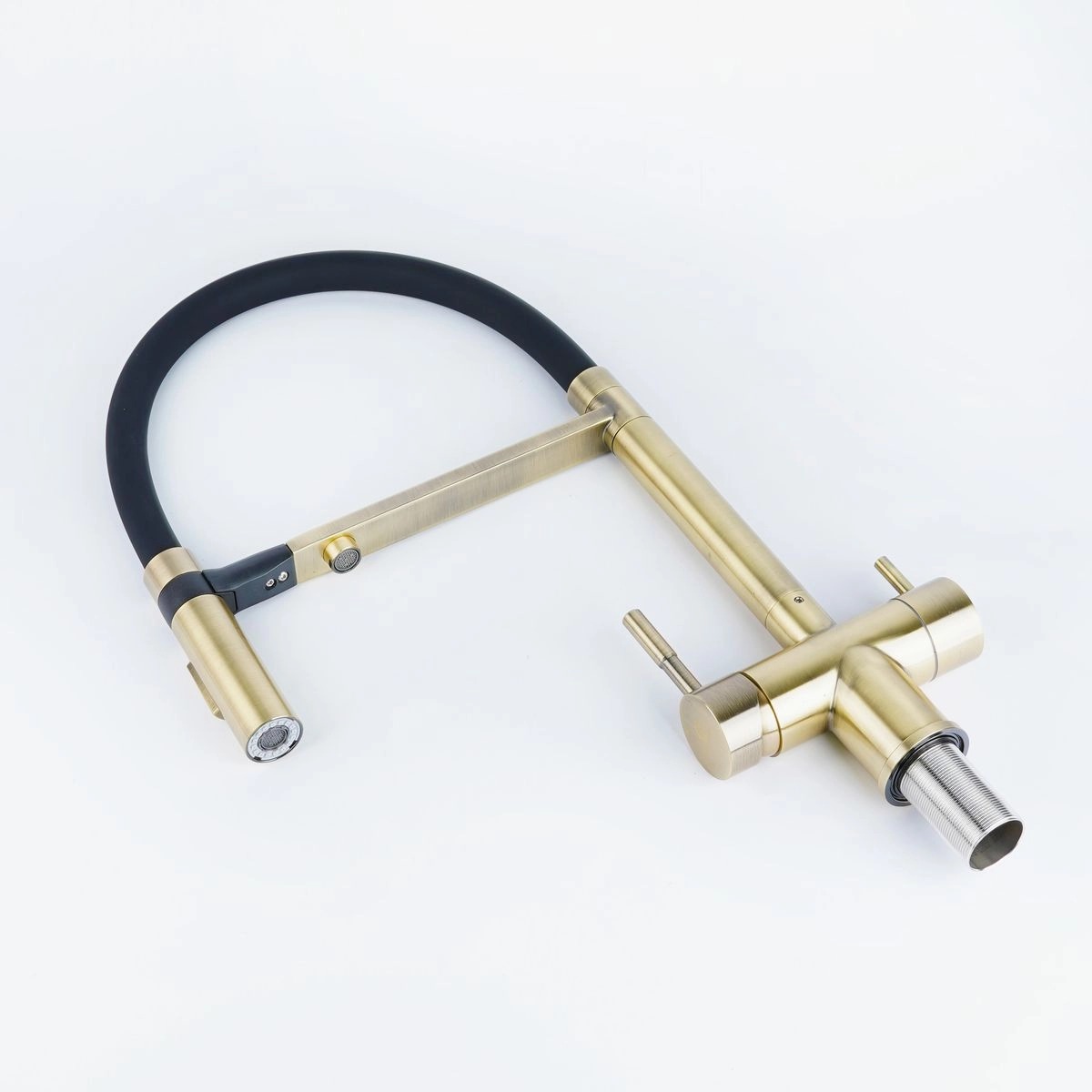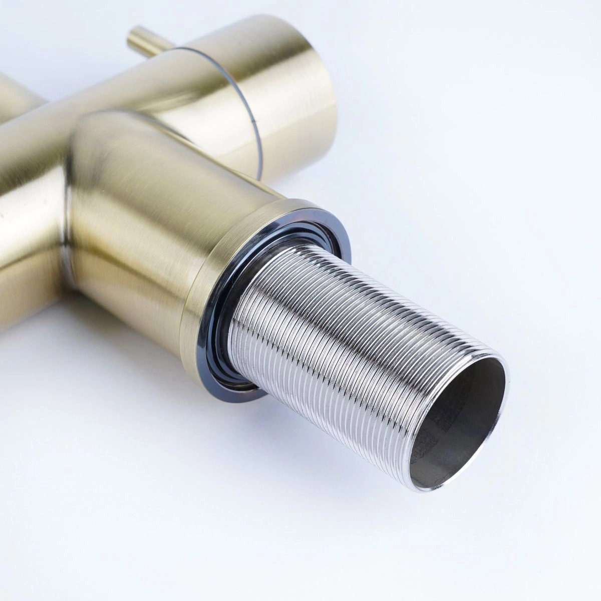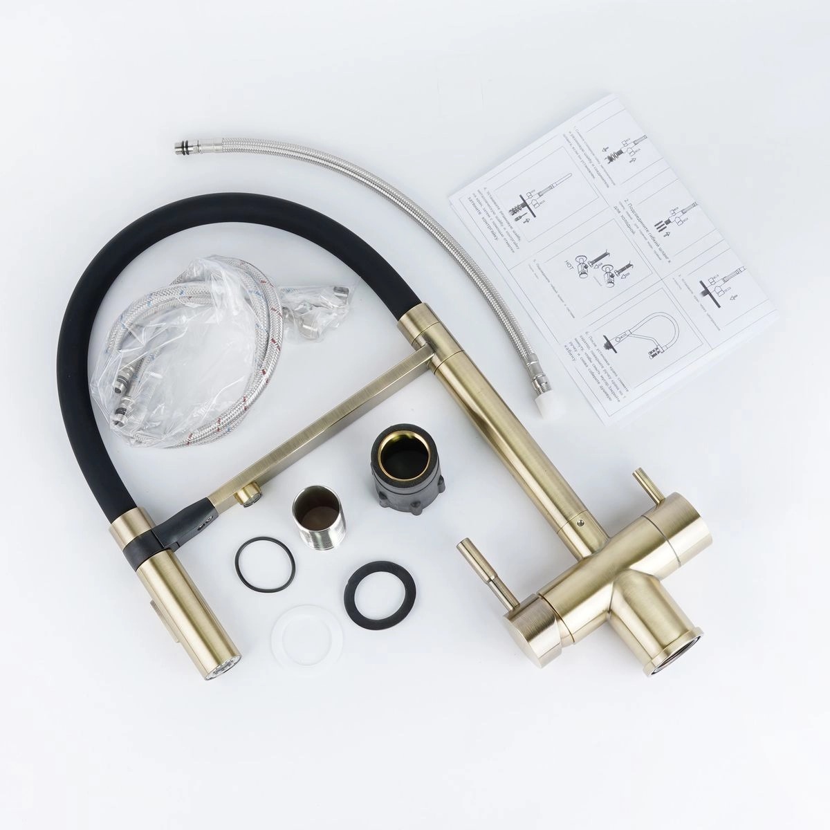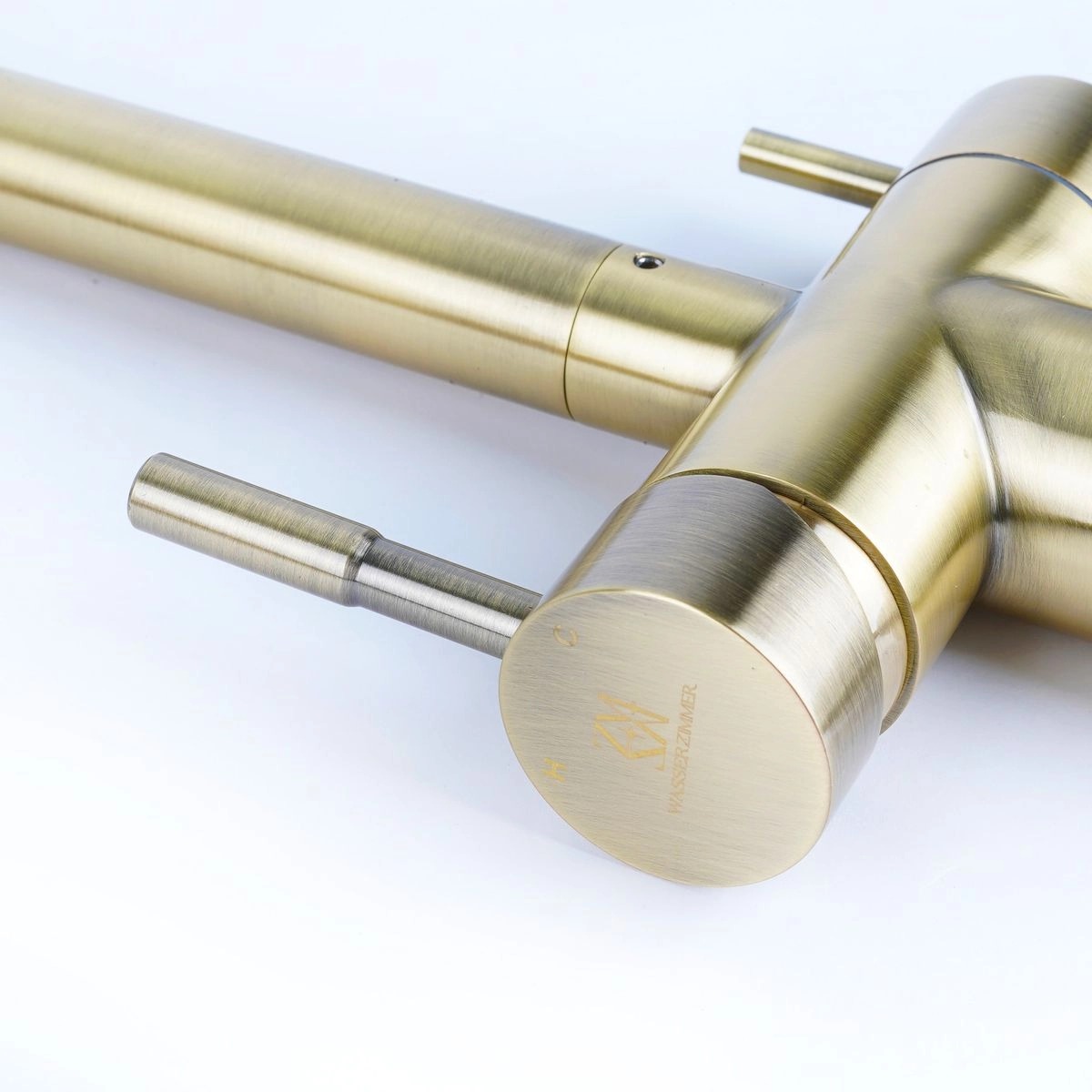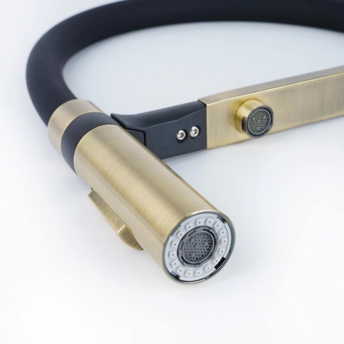 Смеситель для кухни Wasser Zimmer ZM-3011H — это стильное и функциональное решение для современной кухни. Модель выделяется своим необычным дизайном: корпус выполнен в золотом цвете, а гибкий излив — в чёрном, что создаёт эффектный контраст и делает смеситель настоящим украшением кухонного интерьера.