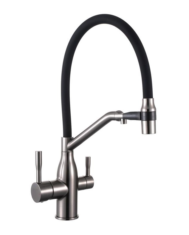 Особенностью модели является сочетание сатинового покрытия корпуса и черного гибкого излива, создающее стильный современный образ. Жесткий излив служит для подачи фильтрованной воды и одновременно выступает кронштейном для гибкого излива, который предназначен для обычной воды. Такая конструкция позволяет легко регулировать направление потока воды в нужном направлении.