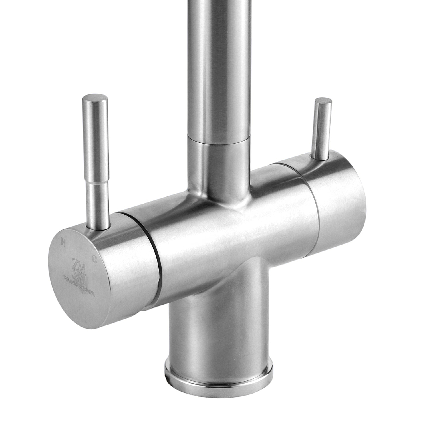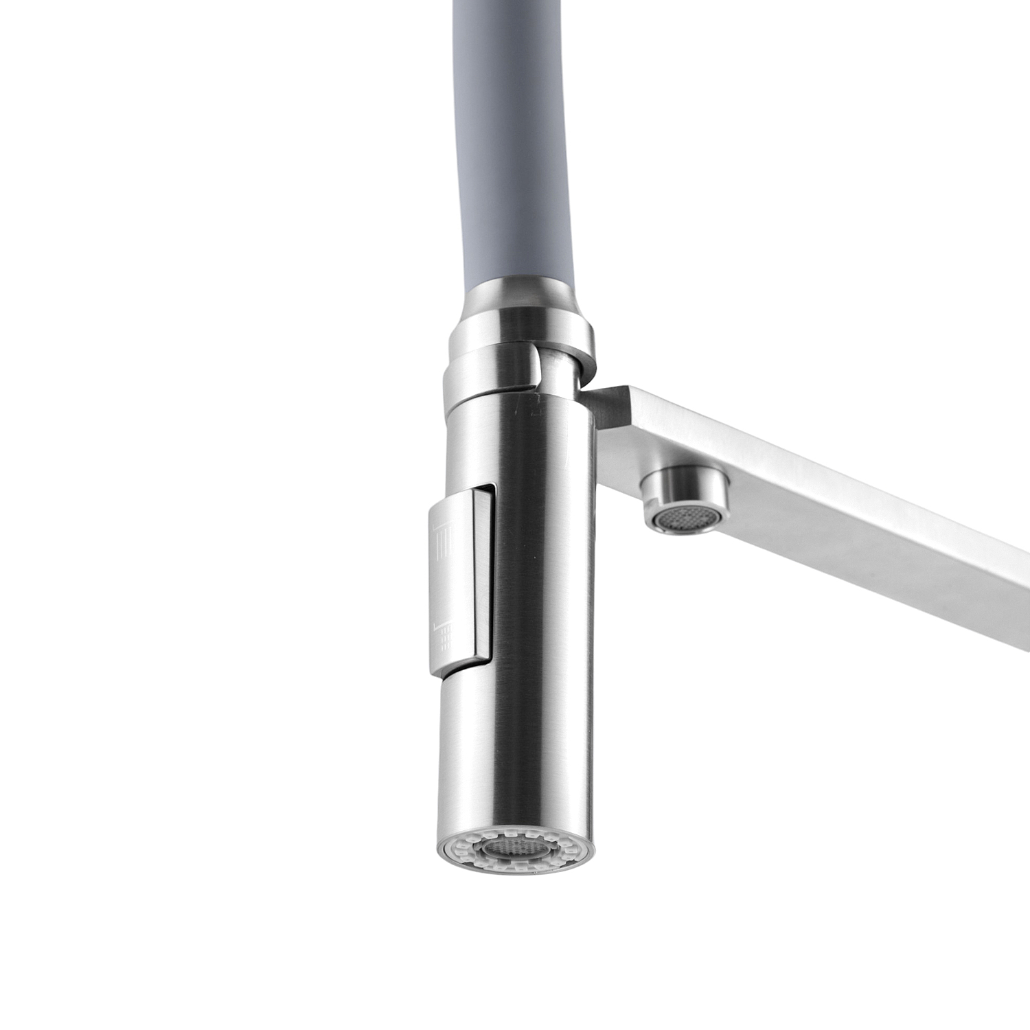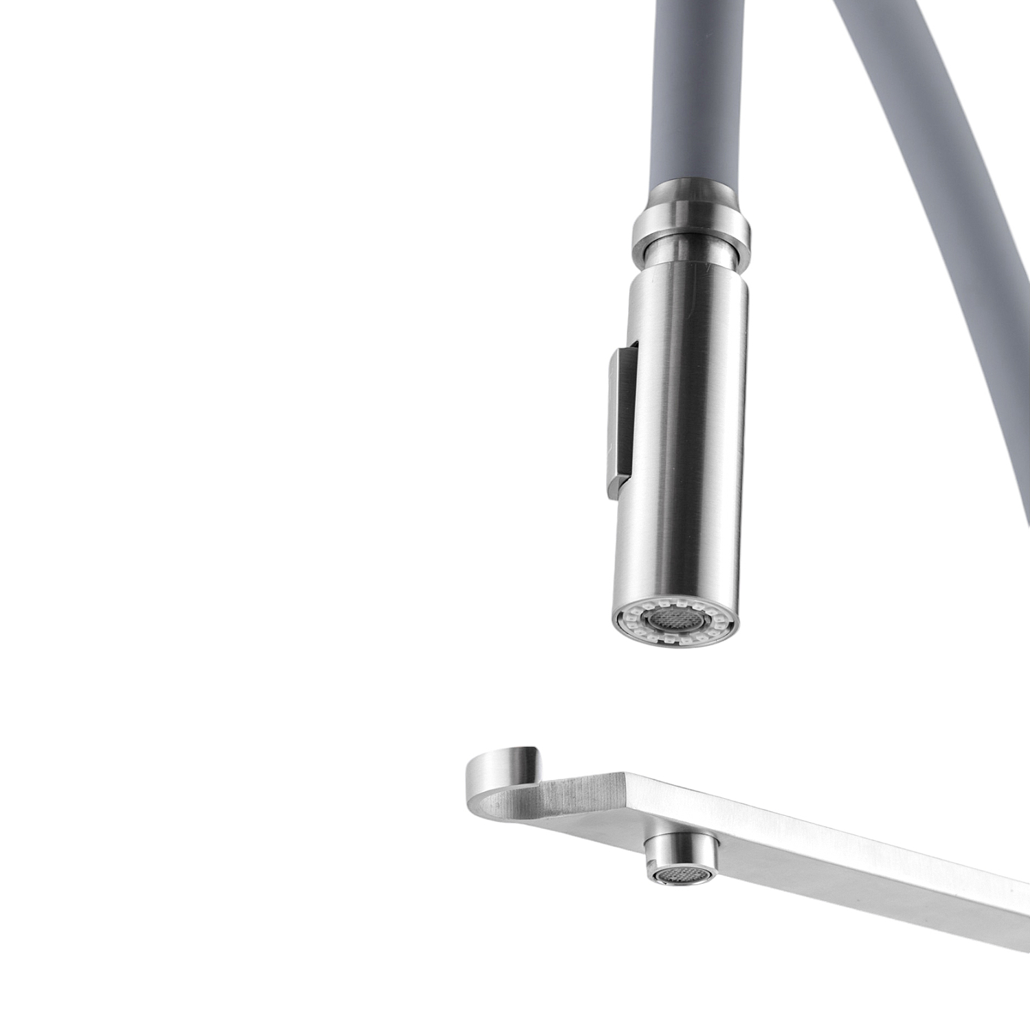 Смеситель для кухни Wasser Zimmer ZM-6012Q в сером исполнении — это современная модель, которая сочетает в себе практичность и стильный дизайн. Корпус смесителя изготовлен из высококачественной нержавеющей стали с матовым серым покрытием, что придает изделию элегантный и современный вид.