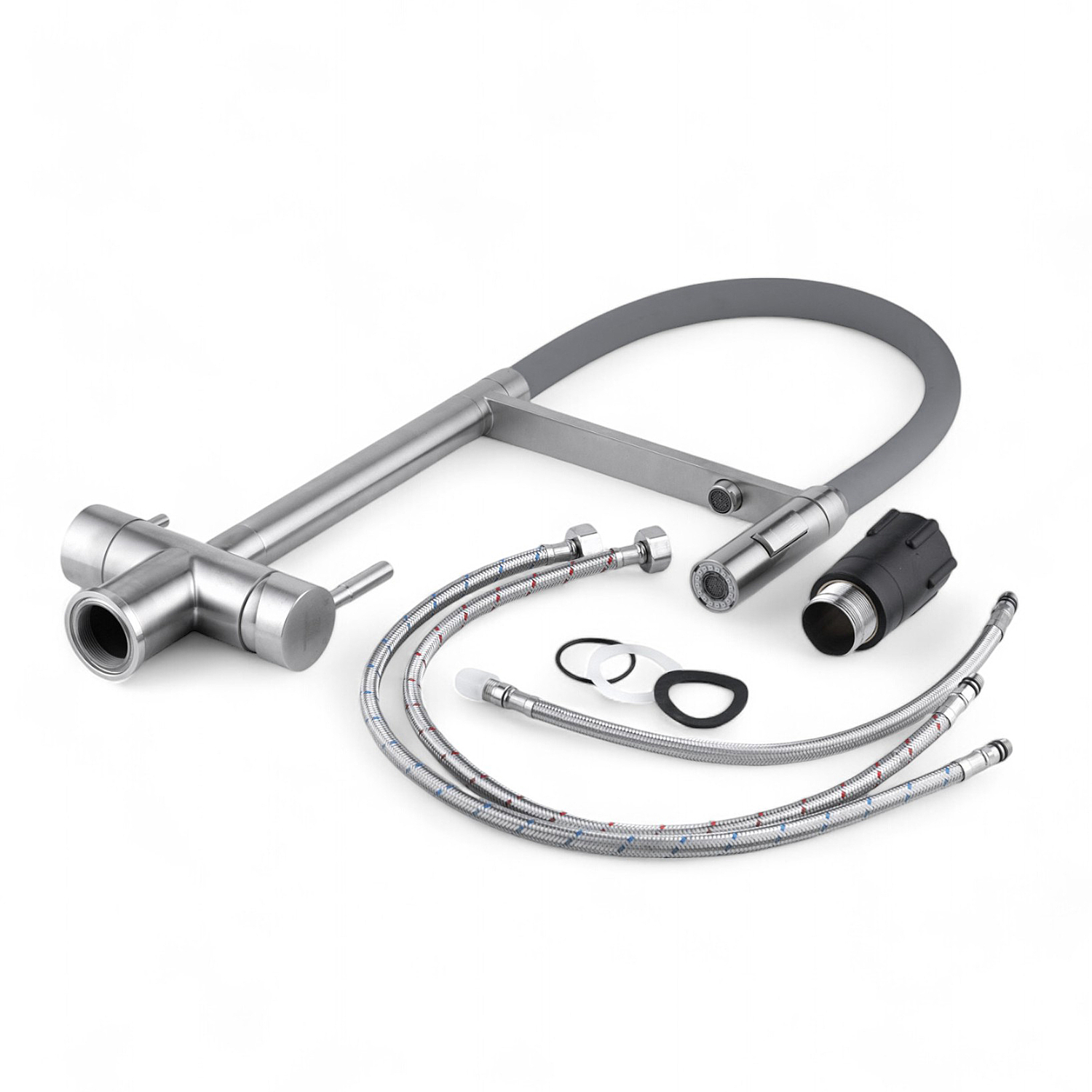 В комплект входят все необходимые элементы для установки, включая подводки для подключения фильтра. Смеситель станет отличным выбором для тех, кто ценит современный дизайн, функциональность и надежность в кухонной сантехнике.