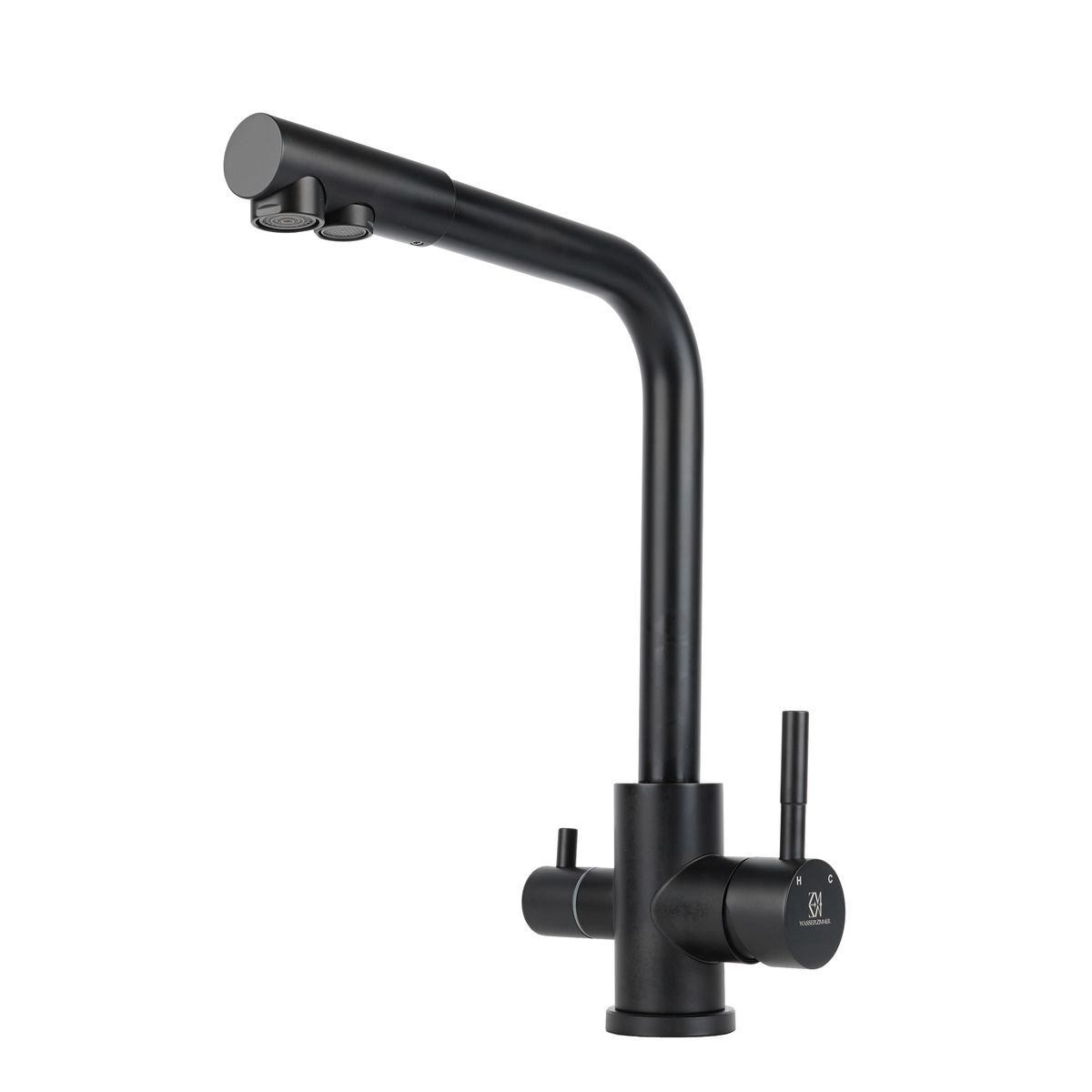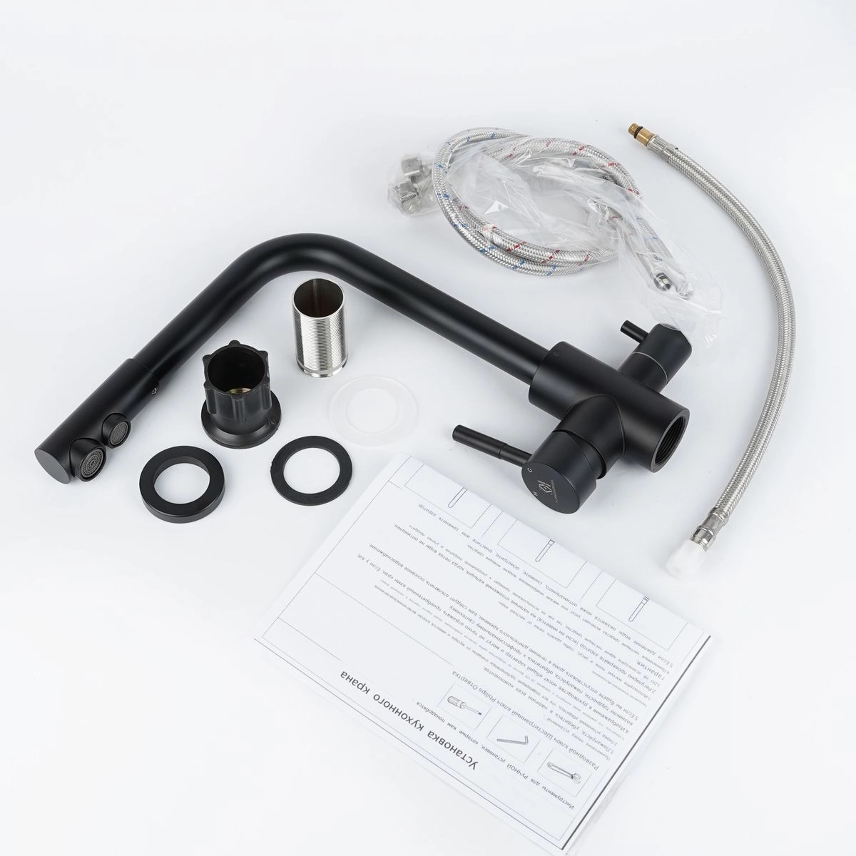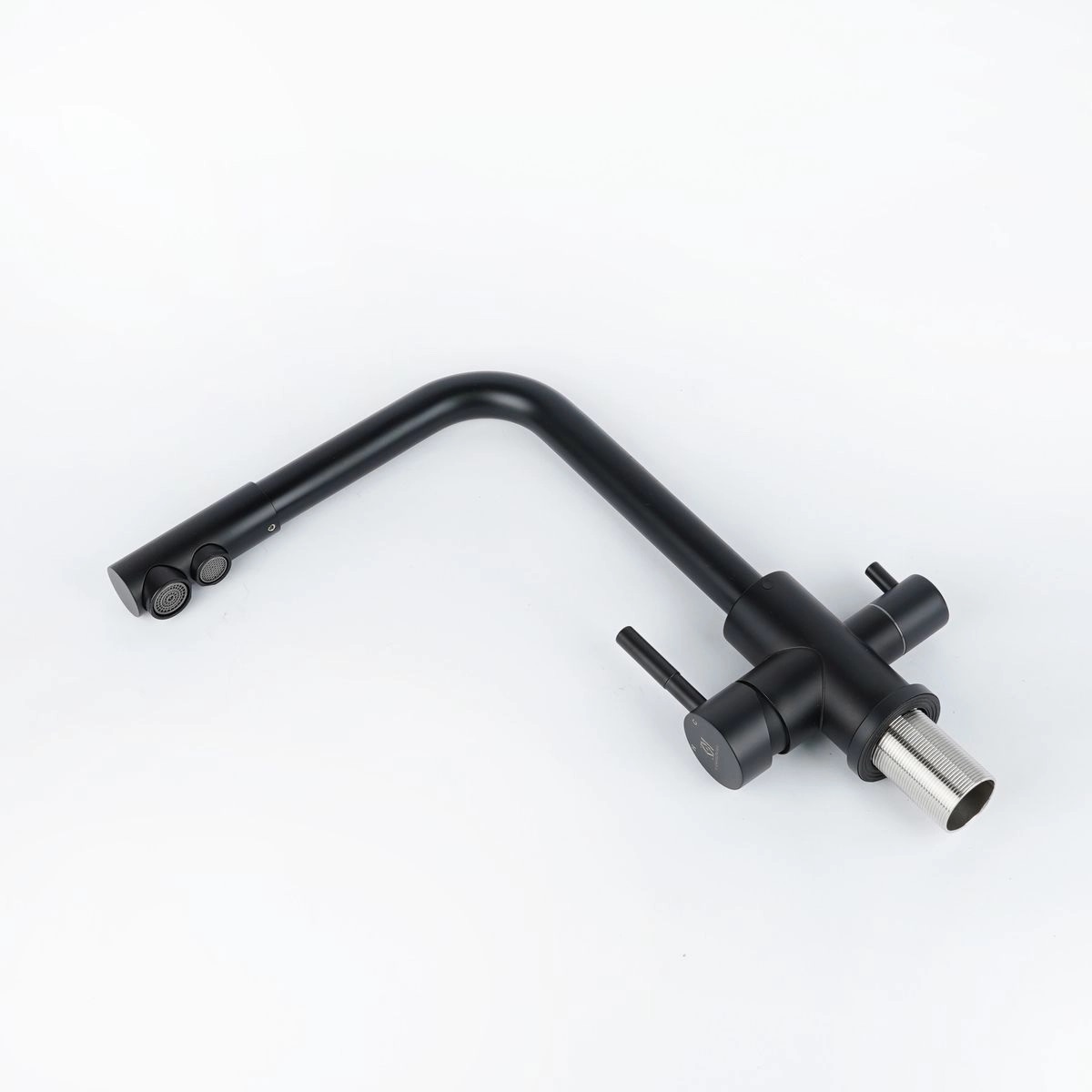Смеситель для кухни с фильтром для питьевой воды из нержавеющей стали черного цвета с высоким Г-образным изливом - это стильное и функциональное решение для кухни и общественных мест. Аэратор смесителя насыщает воду воздухом, что делает ее более мягкой и приятной для использования. Встроенный отдельный канал для фильтрованной воды позволяет, при подключении к любому фильтру, наслаждаться чистой питьевой водой прямо из смесителя. Нет необходимости устанавливать отдельный кран. Смеситель на кухню оснащен жестким изливом, который может крутиться на 360 градусов, что позволяет легко добраться до всех уголков мойки или раковины. Хозяйки по достоинству оценят удобство работы с ним при мытье крупногабаритной посуды. Изящная ручка особенно удобна в применении. Картридж керамический 35 мм.