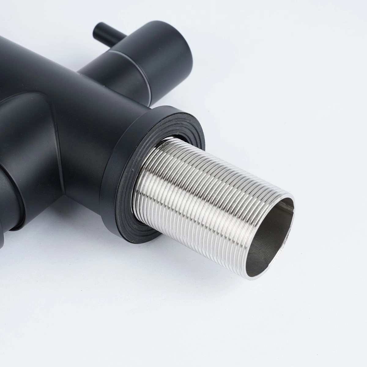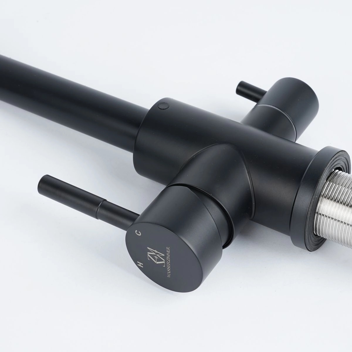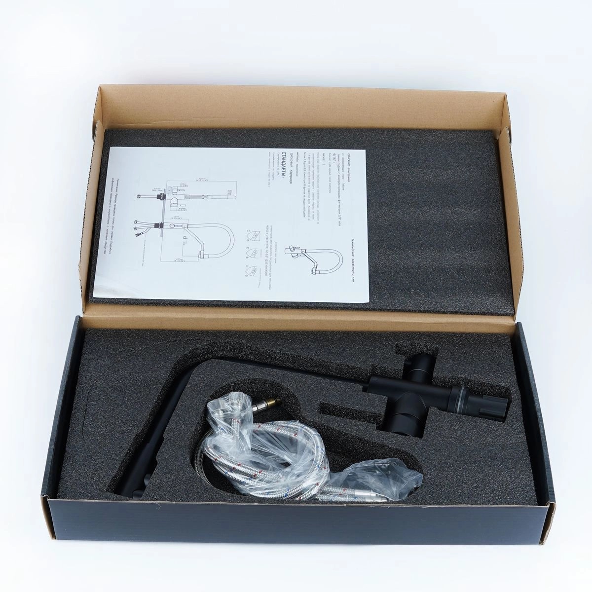 Смеситель для кухни с фильтром для питьевой воды из нержавеющей стали черного цвета с высоким Г-образным изливом - это стильное и функциональное решение для кухни и общественных мест. Аэратор смесителя насыщает воду воздухом, что делает ее более мягкой и приятной для использования. Встроенный отдельный канал для фильтрованной воды позволяет, при подключении к любому фильтру, наслаждаться чистой питьевой водой прямо из смесителя. Нет необходимости устанавливать отдельный кран. Смеситель на кухню оснащен жестким изливом, который может крутиться на 360 градусов, что позволяет легко добраться до всех уголков мойки или раковины. Хозяйки по достоинству оценят удобство работы с ним при мытье крупногабаритной посуды. Изящная ручка особенно удобна в применении. Картридж керамический 35 мм.