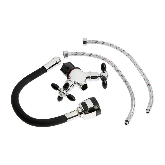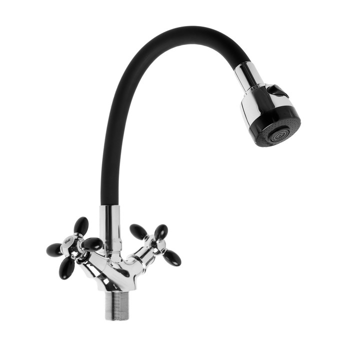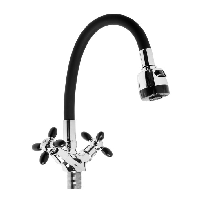 Черно-хромированный смеситель с силиконовым изливом — вентильная модель с гибким носиком. Основание из цинка и пластика, устанавливается на мойку или столешницу.