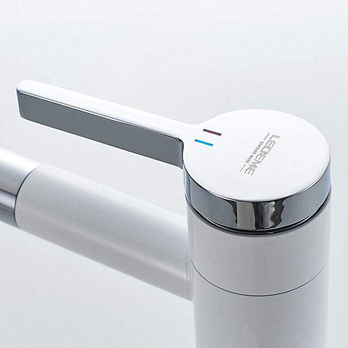Смеситель для раковины Ledeme L1152 изготовлен из латуни, что обеспечивает прочность и долговечность. Поверхность смесителя гладкая, с глянцевым блеском. В комплекте идут гибкая подводка и все необходимые аксессуары, что делает монтаж быстрым и удобным.