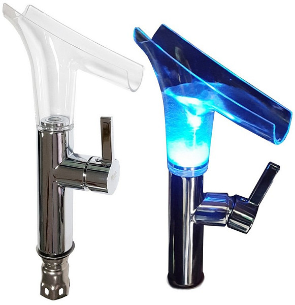 Смеситель для раковины MAK 4101 — это однорычажная модель с эффектным стеклянным изливом и встроенной подсветкой. Особенность устройства — визуальная «фишка»: вода подаётся в форме водоворота, что создаёт оригинальный декоративный эффект. При этом подсветка (красная и синяя) работает без батареек — энергия генерируется потоком воды.