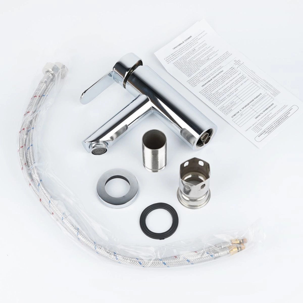 Монтаж смесителя производится на шпильках через специально подготовленное отверстие в раковине — крепление осуществляется винтами с задней стороны. В комплект поставки входят сам смеситель, гибкая подводка, прокладки и инструкция по установке.