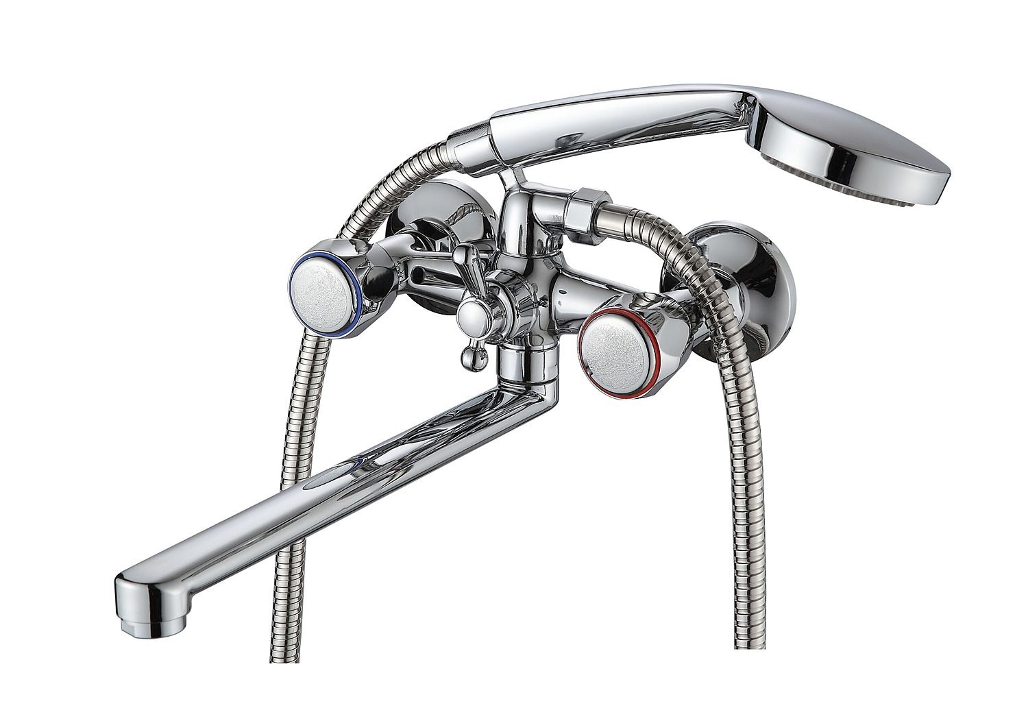 Управление осуществляется при помощи двух керамических кран-букс с 20 шлицами, которые обеспечивают плавное вращение на 180 градусов и точную регулировку температуры воды. Переключение между режимами ванна/душ осуществляется с помощью шарового переключателя, способного поворачиваться на 360 градусов, что делает использование смесителя максимально удобным.