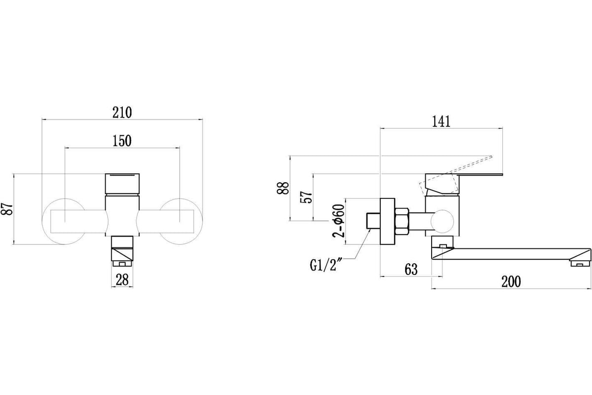 Смеситель рассчитан на настенный монтаж в два отверстия, используется жёсткая подводка со стандартом 1/2". Душевой гарнитур в комплект не входит — модель ориентирована на базовое использование без лишних элементов.