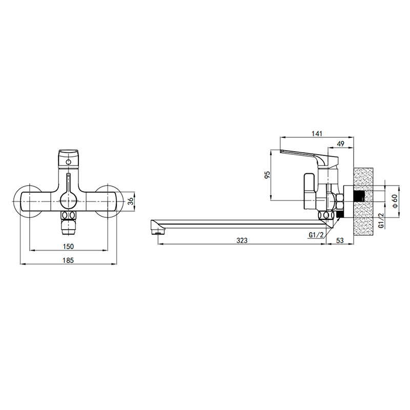 Монтаж производится на два отверстия на стене с помощью стандартной подводки 1/2 дюйма. Межосевое расстояние составляет 150 мм. Хромированное покрытие придает смесителю элегантный внешний вид и защищает от механических повреждений.
