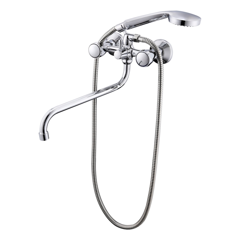 В комплект входят все необходимые элементы для монтажа: сам смеситель, душевая лейка, шланг, держатель для лейки, эксцентрики и отражатели.
