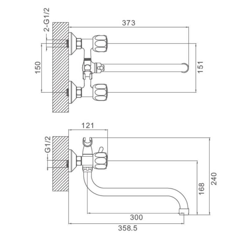 Монтаж производится на стену, для установки требуется два монтажных отверстия с межосевым расстоянием 150 миллиметров. Подводка жесткая, стандартного размера 1/2 дюйма. На изливе установлен аэратор, который делает поток воды более мягким и равномерным.