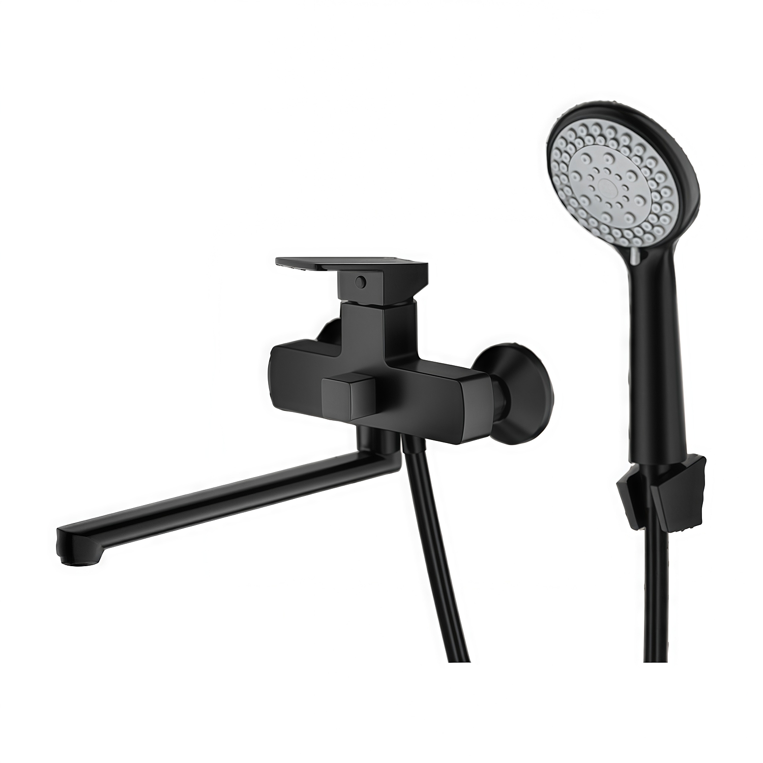 В комплект входит все необходимое для полноценного использования: душевая лейка с несколькими режимами струи, гибкий шланг длиной 150 сантиметров и настенный держатель.