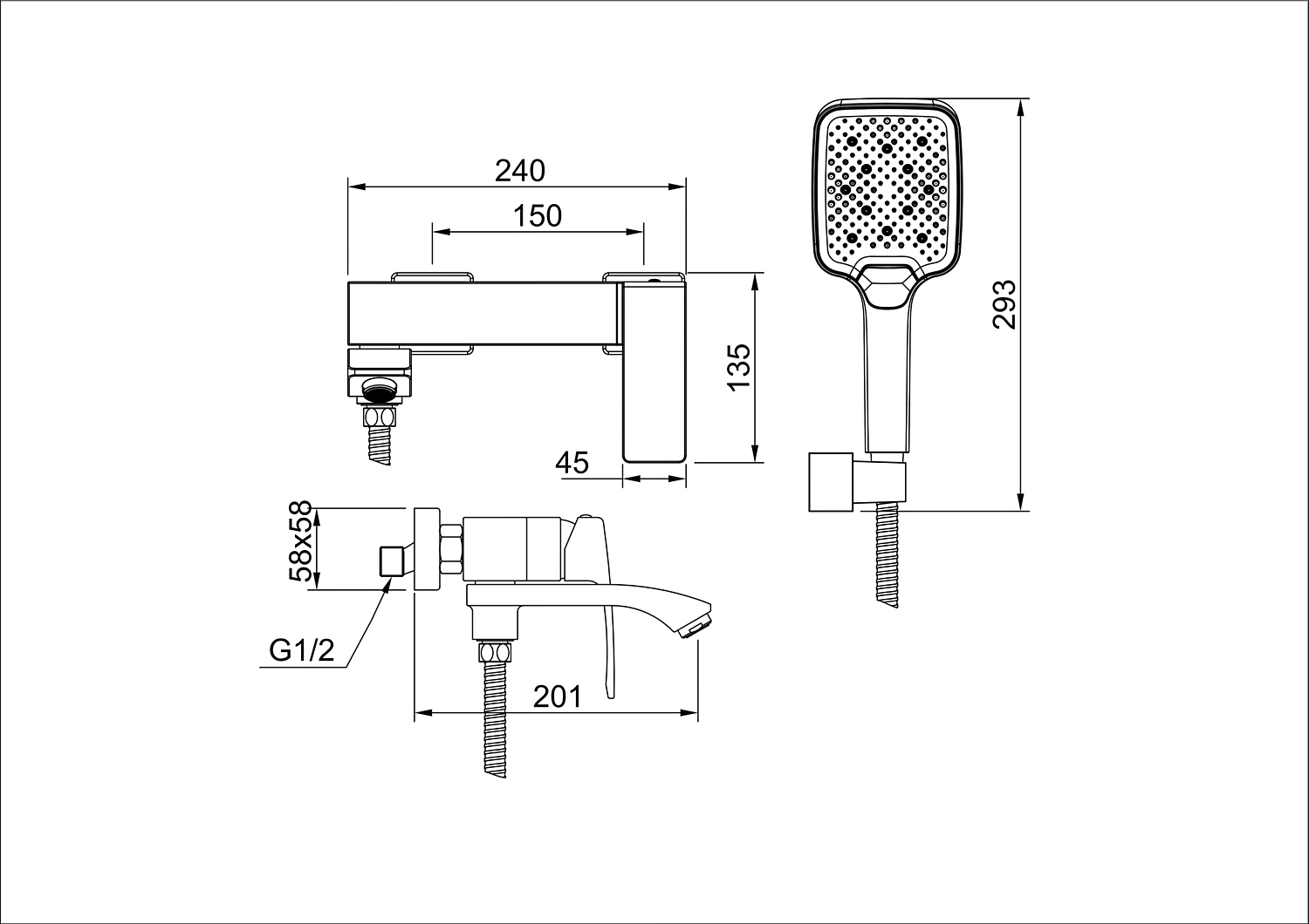 Смеситель оснащен трехрежимной душевой лейкой и стальным душевым шлангом длиной 1,5 метра. Система переключения между режимами ванна/душ реализована через двухпозиционный картриджный переключатель с углом поворота 90°.