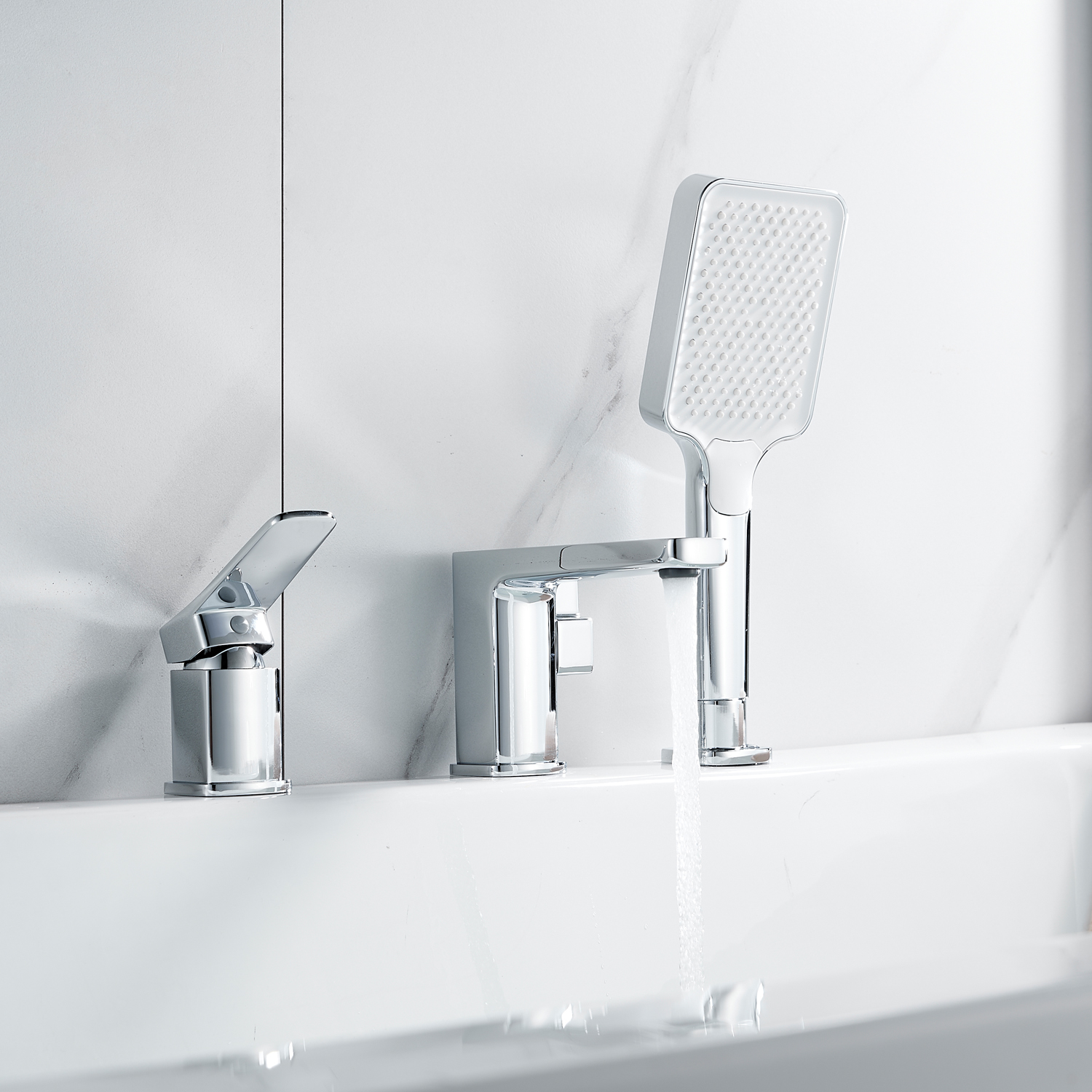 В комплектацию входят: смеситель, излив с переключателем потоков, лейка с 3 режимами струи, душевой шланг длиной 150 см (с защитой от перекручивания), держатель лейки, гибкая подводка и комплект креплений. Ручной душ выполнен из ABS‑пластика.