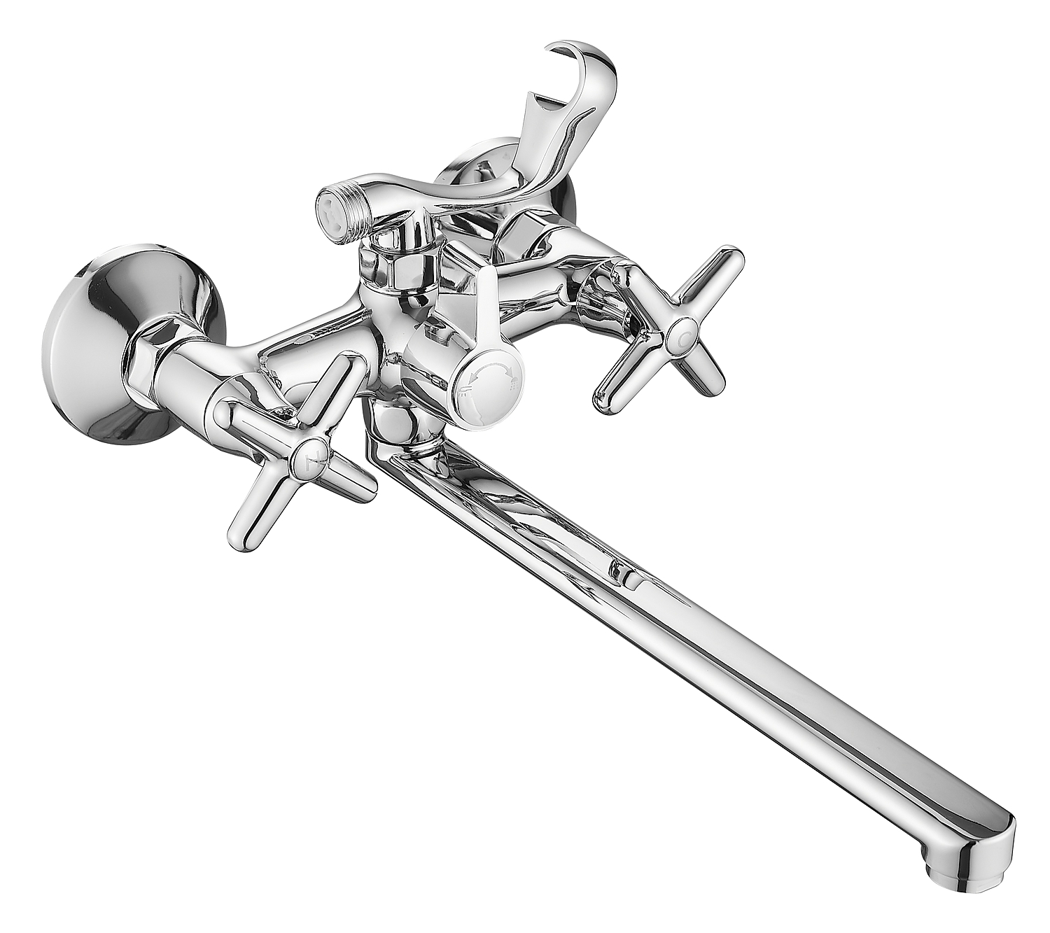 В комплект входит полный душевой набор: трехрежимная лейка, металлический шланг длиной 150 сантиметров с защитой от перекручивания и настенный держатель. Переключатель ванна/душ позволяет легко менять режимы использования.