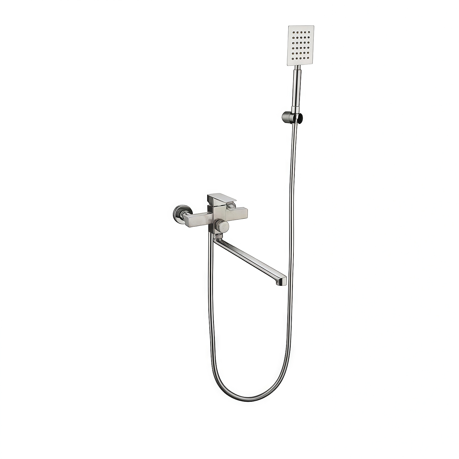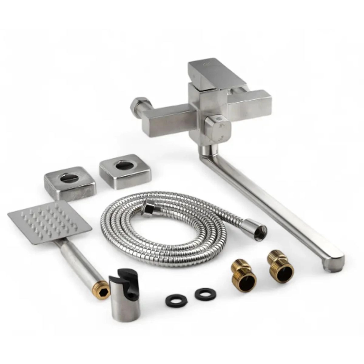 Дизайн смесителя универсален и впишется в разные варианты оформления ванной комнаты. Конструкция рассчитана на настенный монтаж. Устройство сочетает в себе функциональность и доступную цену, подходит для установки как в жилых, так и в коммерческих помещениях.