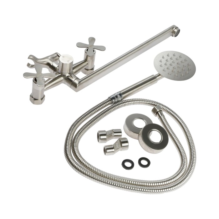 Комплект для ванны: двухвентильный смеситель с душем, сатин — готовое решение для ванной комнаты. В набор входит смеситель с поворотным изливом, душевая лейка и шланг. Корпус из нержавеющей стали с матовым покрытием «сатин».