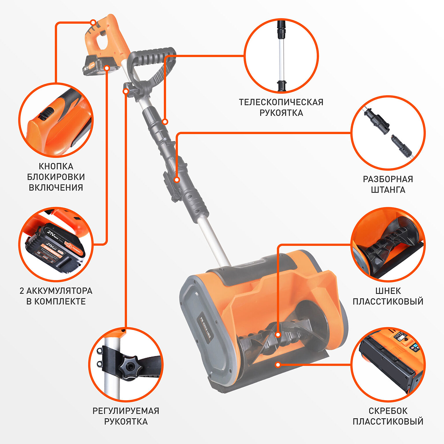 Аккумуляторная лопата-снегоуборщик PATRIOT PE 1003 UES для очистки дорожек на приусадебных участках или городских дворах. Телескопическая рукоятка позволит без труда убрать инструмент в небольшой шкаф или в багажник легкового автомобиля. Шнек выполнен из пластика, не оставляющего царапин на декоративных покрытиях участка. Для питания используется аккумулятор системы UES.