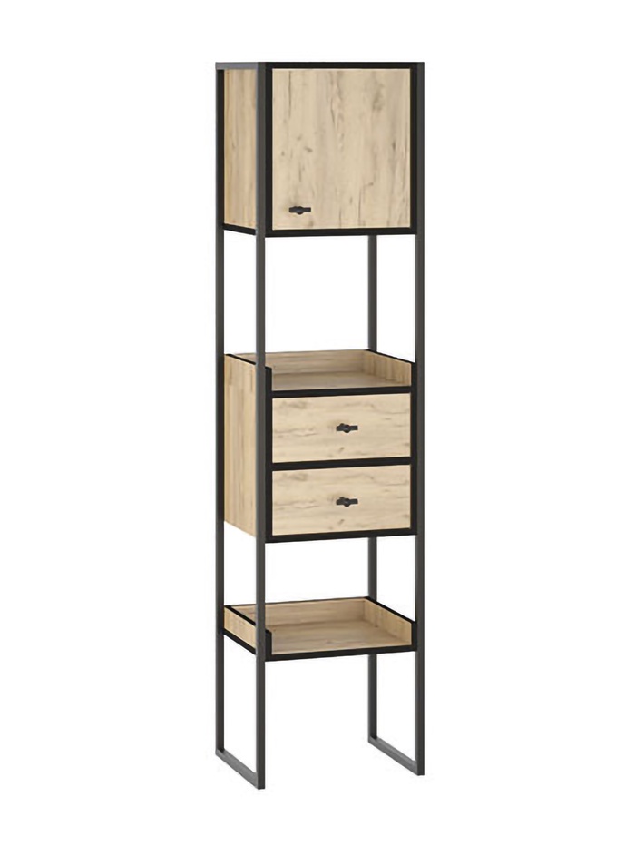 Эффектное и функциональное решение для хранения в стиле лофт. Стеллаж выполнен в выразительной комбинации оттенков: теплая текстура дуба крафт золотой с его благородной древесной фактурой контрастирует с глубоким черным цветом, создавая брутальный и одновременно утонченный образ.