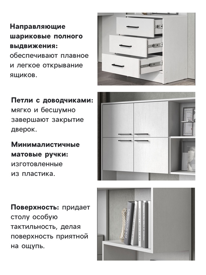 Минималистичные матовые ручки: изготовленные из пластика, дополняют дизайн стола, придавая ему завершенный и стильный облик.