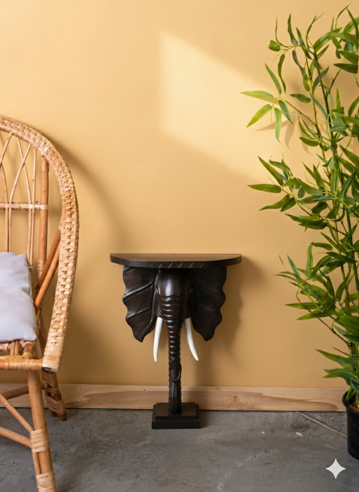 Деревянный стол с центральной опорой в форме слона придает интерьеру скульптурную выразительность. Трапециевидная столешница из массива альбезии создает удобную рабочую поверхность. Модель высотой 100 см органично вписывается в пространство гостиной или кабинета.